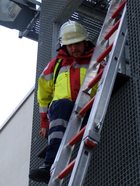 So wurde unter anderem das Einsteigen in ein Fenster im 1. Obergeschoss über eine Steckleiter und das sichere Betreten und Absteigen einer Rettungsplattform geübt.