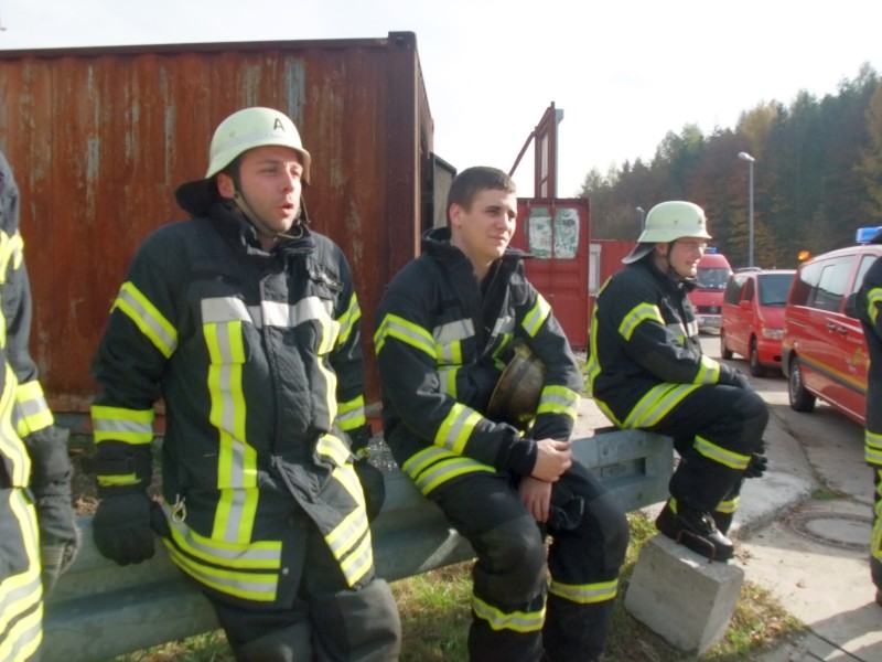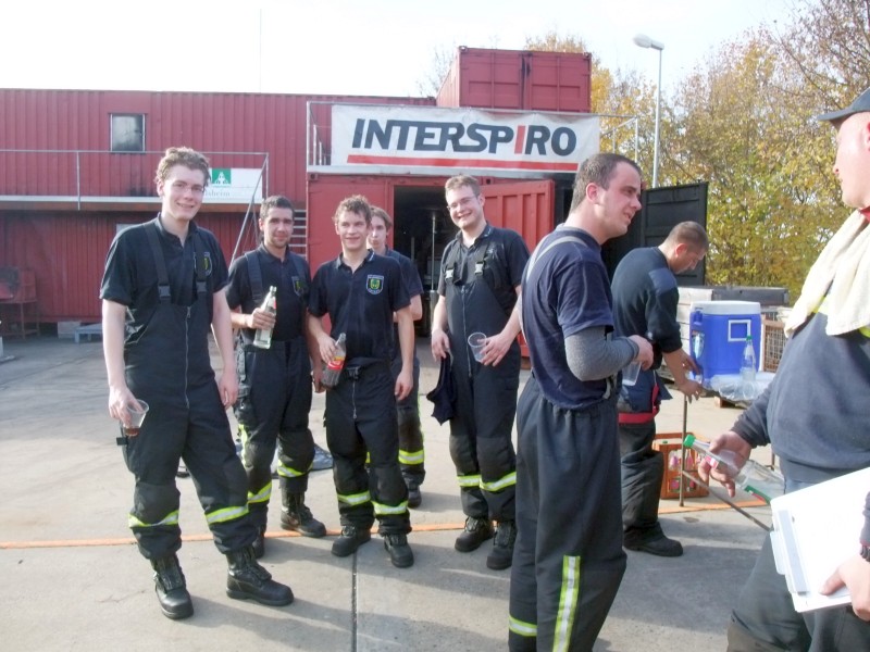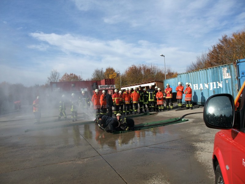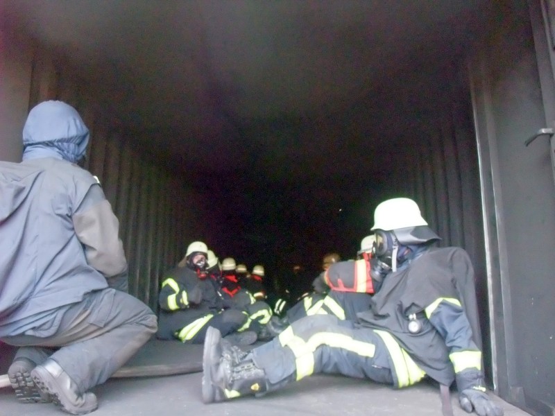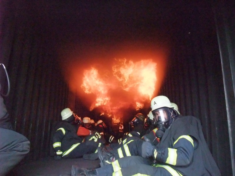 Nach der Theorie folgte die Praxis in Form eines ersten Durchgangs durch die Brandübungsanlage bei dem die Wärmeentwicklung, das Ausgasen von Feststoffen, die Bedeutung der verschiedenen Rauchschichten und die des Wasserdampfes, bei der Brandbekämpfung, im Vordergrund standen.