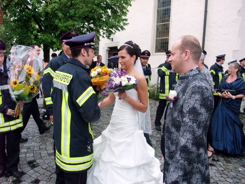 Hierbei ließ es sich die Feuerwehr Asperg nicht nehmen, für das Brautpaar Spalier zu stehen. Kommandant Stefan Fritz überbrachte die Glückwünsche der gesamten Wehr und übergab dabei ein Geschenk.