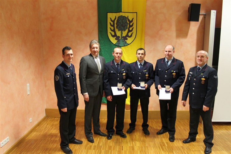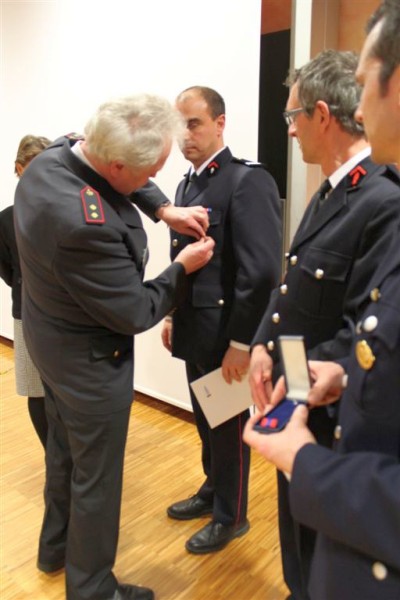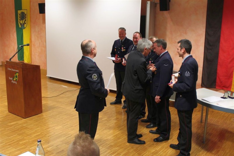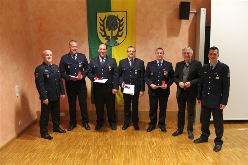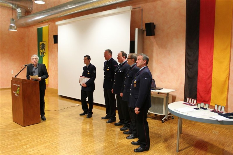 Staatssekretär Jürgen Walter ehrte an diesem Abend in Vertretung für Innenminister Reinhold Gall, Brandmeister Thomas Lohmiller, Oberlöschmeister Lutz Walker, Hauptfeuerwehrmann Jürgen Wemmer und Hauptfeuerwehrmann Alexander Reich mit dem Feuerwehr Ehrenzeichen des Landes Baden-Württemberg in Silber. Alle vier leisten bereits seit 25 Jahren pflichttreuen Feuerwehrdienst und rückten zu zahlreichen Einsätzen zum Wohle der Bürger der Stadt Asperg aus.