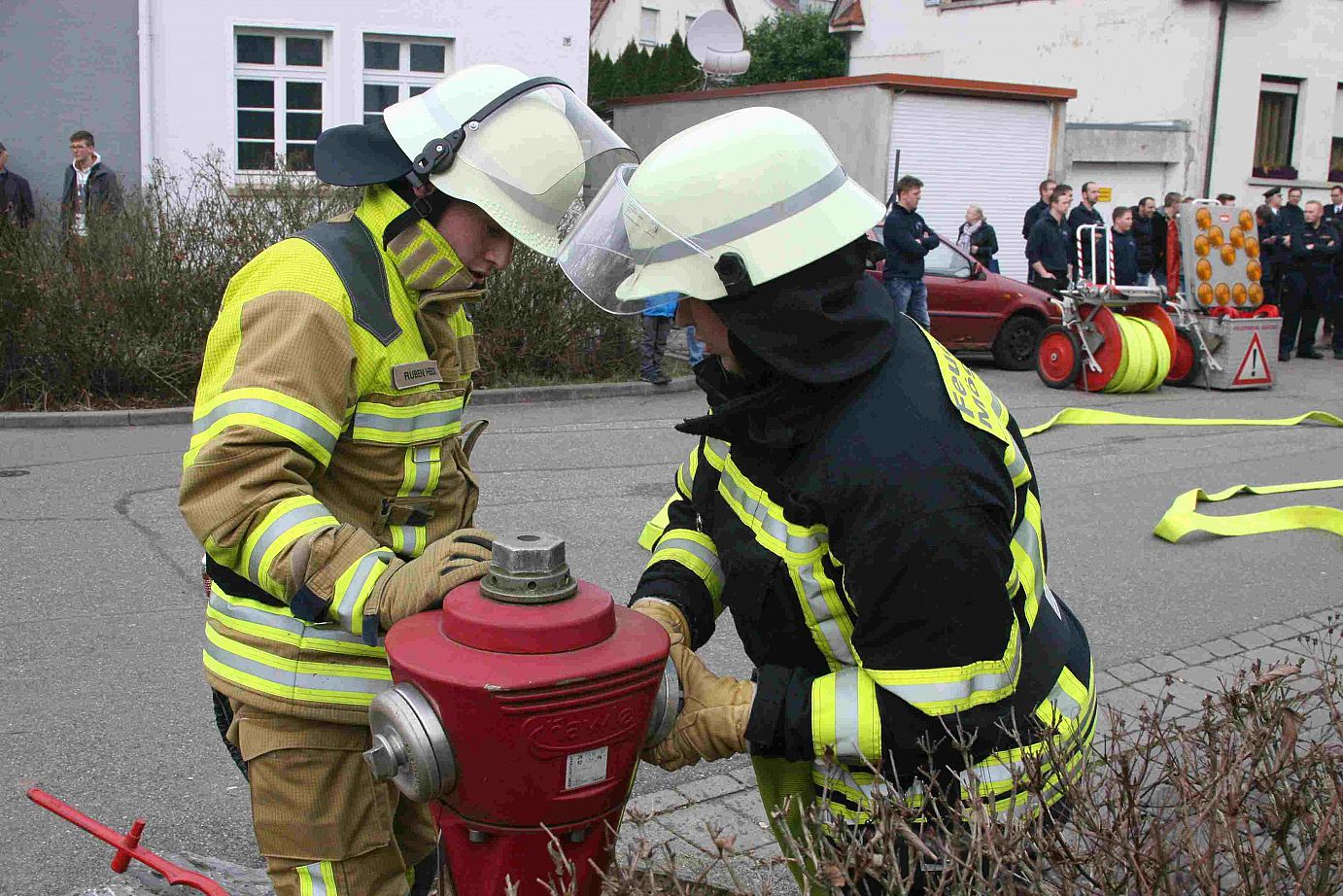 Die Feuerwehranwärter aus den Feuerwehren des Landkreises, darunter 5 aus Asperg, zeigten ihr Können in verschiedenen Schauübungen. Den Zuschauern wurde gezeigt, wie eingeklemmte Personen mit verschiedenem Werkzeug, unter anderem dem hydraulischem Rettungsgerät, bestehend aus Schere und Spreizer, aus einem PKW befreit werden konnten. Zuvor wurde ein dreiteiliger Löschangriff mit Personenrettung über tragebare Leitern gezeigt.