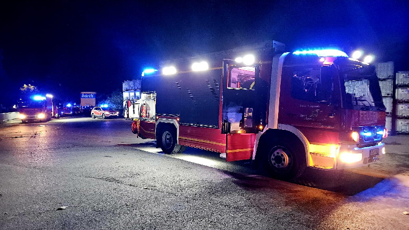 Fahrzeugaufgebot   Kommandowagen (KdoW)  Einsatzleitwagen (ELW 1)  Hilfeleistungslöschgruppenfahrzeug 1 (HLF 1)  Hilfeleistungslöschgruppenfahrzeug 2 (HLF 2)  Drehleiter (DLK 23/12)  Gerätewagen Transport (GW-T)  Anhänger mit Sonderlöschmittel