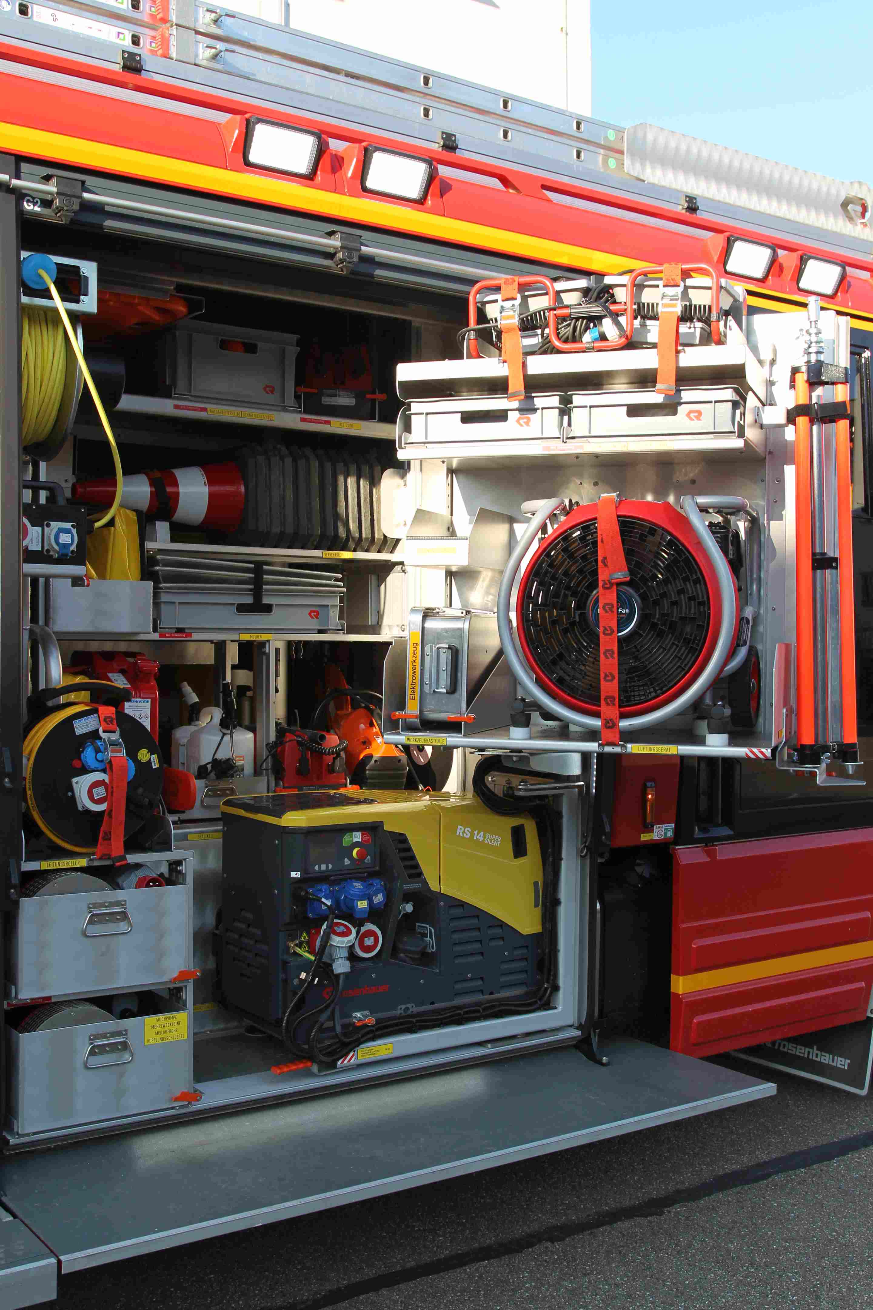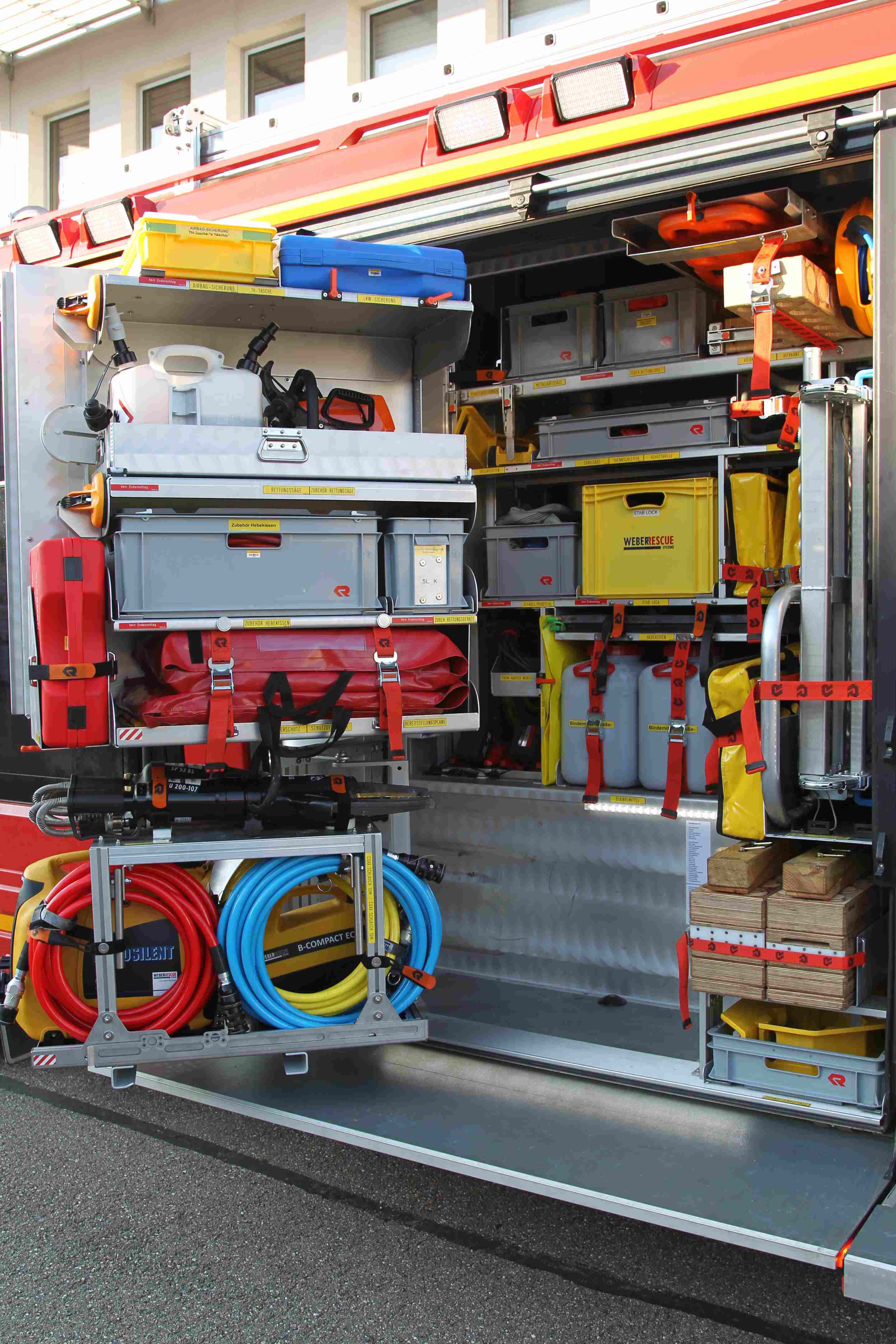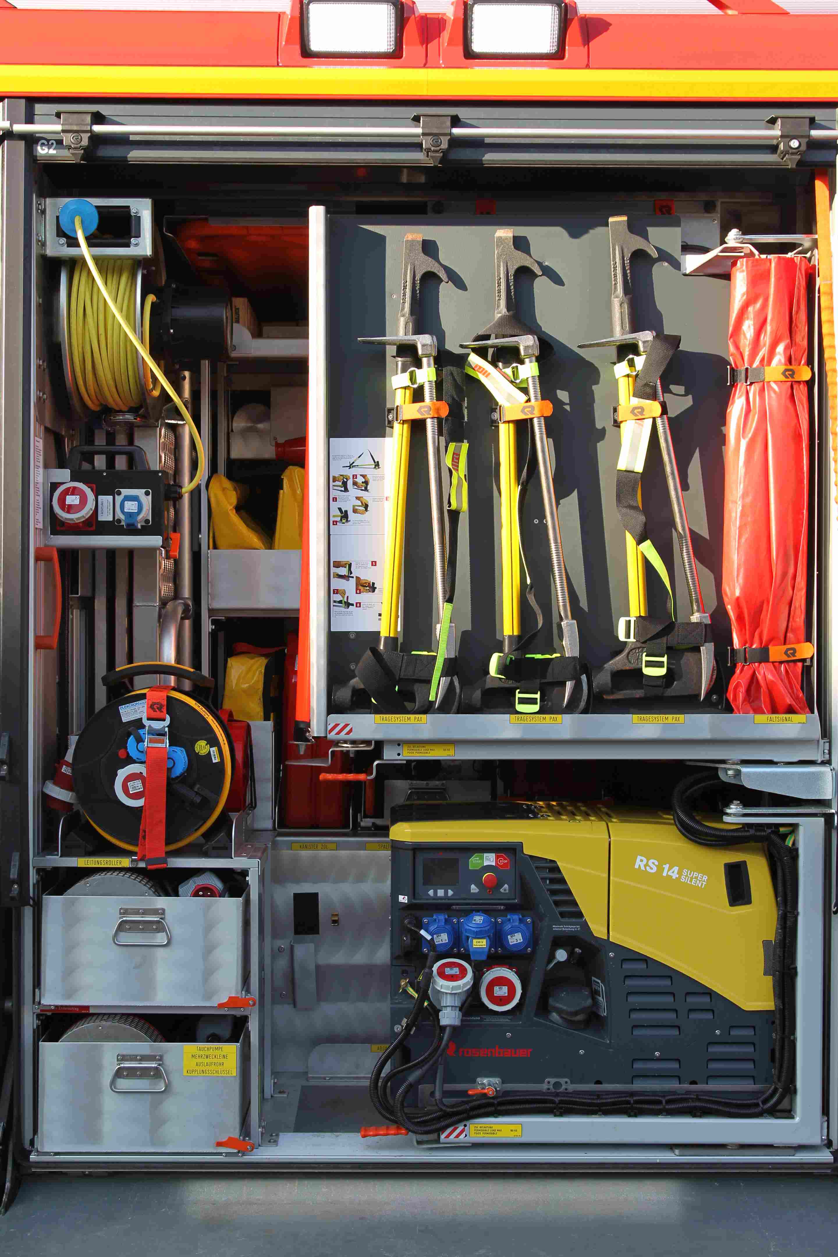 - Hydraulisches Rettungsgerät: je Motorpumpe mit Akku und Benzin, Schneidgerät, Spreizer, drei hydraulische Rettungsteleskopzylinder inkl. Crossrammer, Pedalschneider
