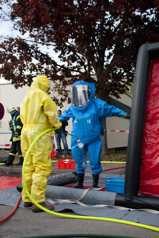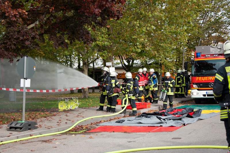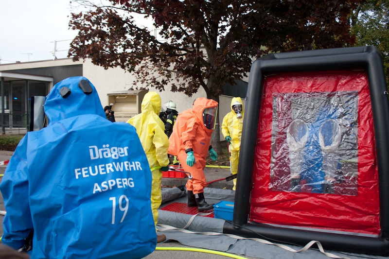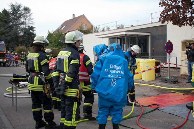 Die Feuerwehr Asperg, die den Gefahrstoffzug für den Landkreis Ludwigsburg stellt, rückte an und ging mit mehreren Trupps unter CSA (Chemikalienschutzanzügen) in das Gebäude. Dort wurde die Flasche verschlossen und in einen speziellen, von einer ansässigen Firma herbeigebrachten Behälter, geborgen. Weitere Trupps unter CSA sorgten für die Belüftung des Gebäudes, sodass dieses wieder ohne Gefahr betreten werden konnte.
