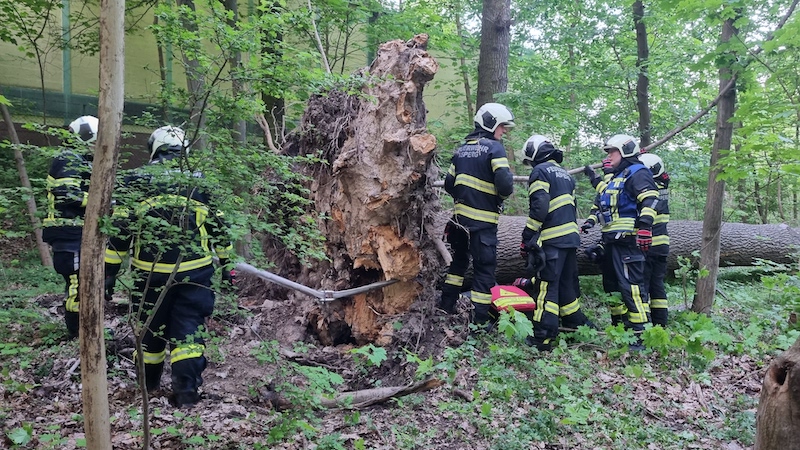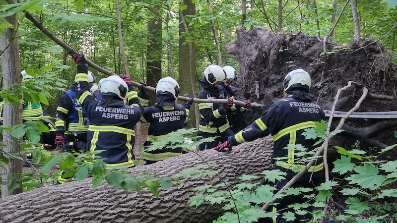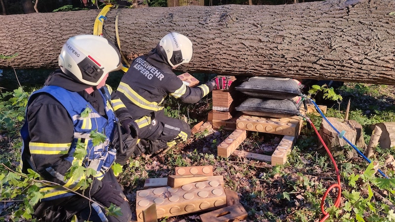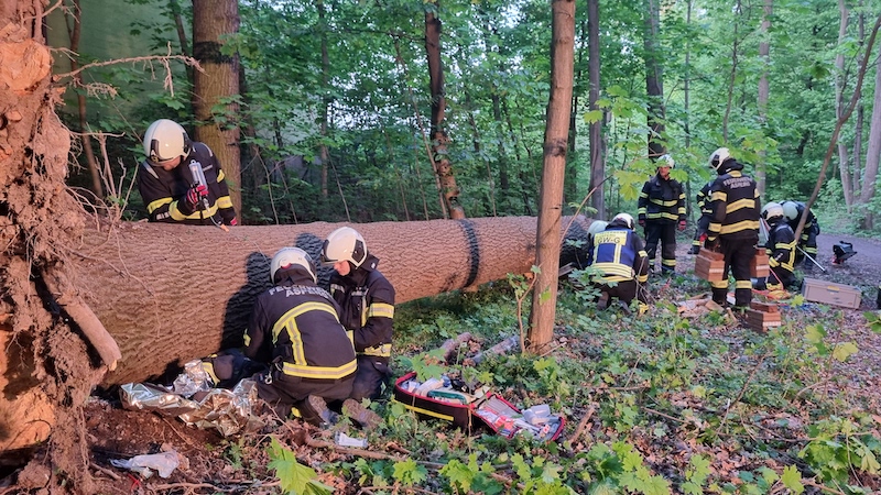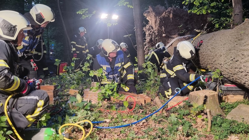Nicht nur das unwegsame Gelände und die Dunkelheit sondern auch das enorme Gewicht des Baums stellte die Einsatzkräfte vor Herausforderungen, die aber allesamt routiniert gemeistert werden konnten.