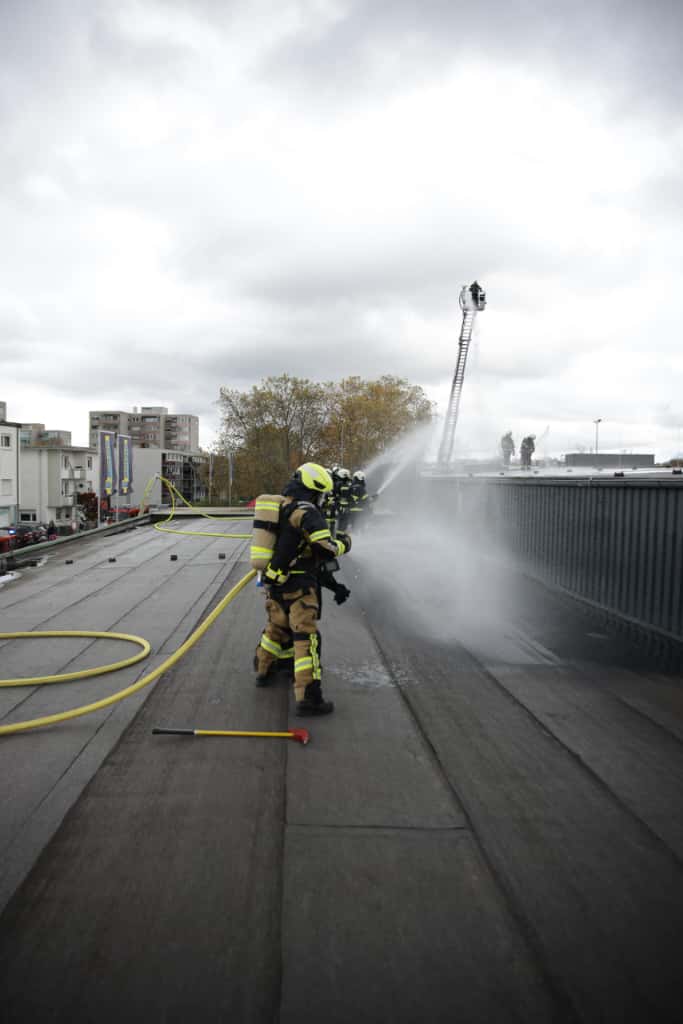 Zur Brandbekämpfung und Menschenrettung wurden zwei Drehleitern eingesetzt, zahlreiche Trupps unter Atemschutz waren im gesamten Gebäude und auf dem Dach im Einsatz. Insgesamt waren rund 100 Einsatzkräfte beteiligt – ein eindrucksvolles Bild für die zahlreichen Zuschauerinnen und Zuschauer, die sich vor Ort einfanden.