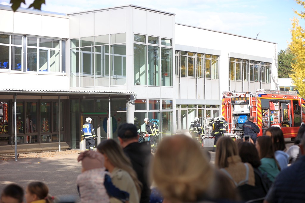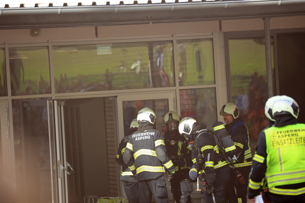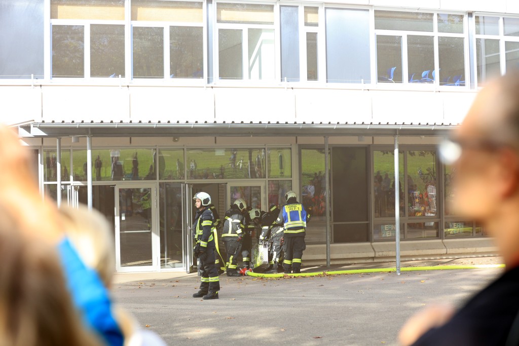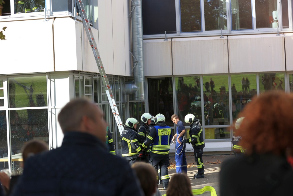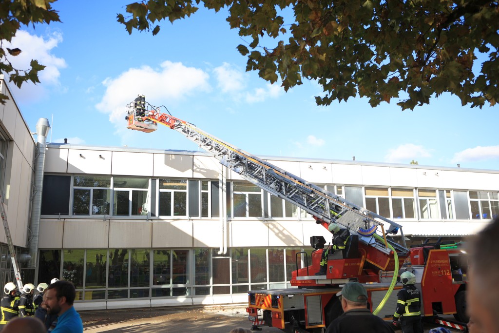 Das mittlerweile am Übungsort eingetroffene Hilfeleistungslöschgruppenfahrzeug 1 (HLF 1) erhielt die Aufgabe, die Menschenrettung und die Brandbekämpfung einzuleiten. Sofort gingen zwei Trupps mit jeweils einem Löschrohr unter schwerem Atemschutz in das Gebäude vor. Zeitgleich wurde die Rettung der Schüler in dem Klassenzimmer über eine tragbare Leiter vorbereitet. Zur Rettung der Arbeiter auf dem Dach wurde die Drehleiter der Feuerwehr Asperg in Stellung gebracht. Eine Rettung der Personen ist so schnell und relativ sicher möglich.