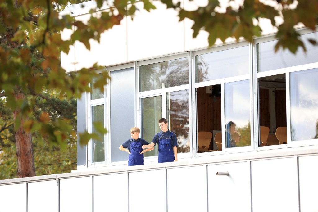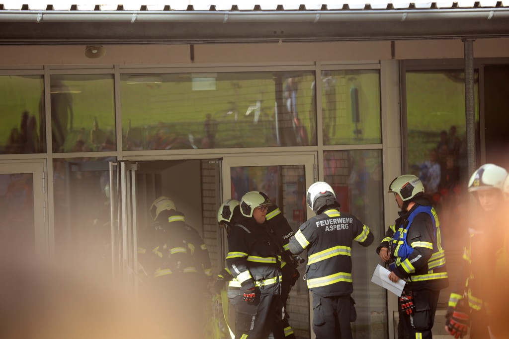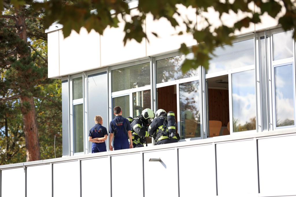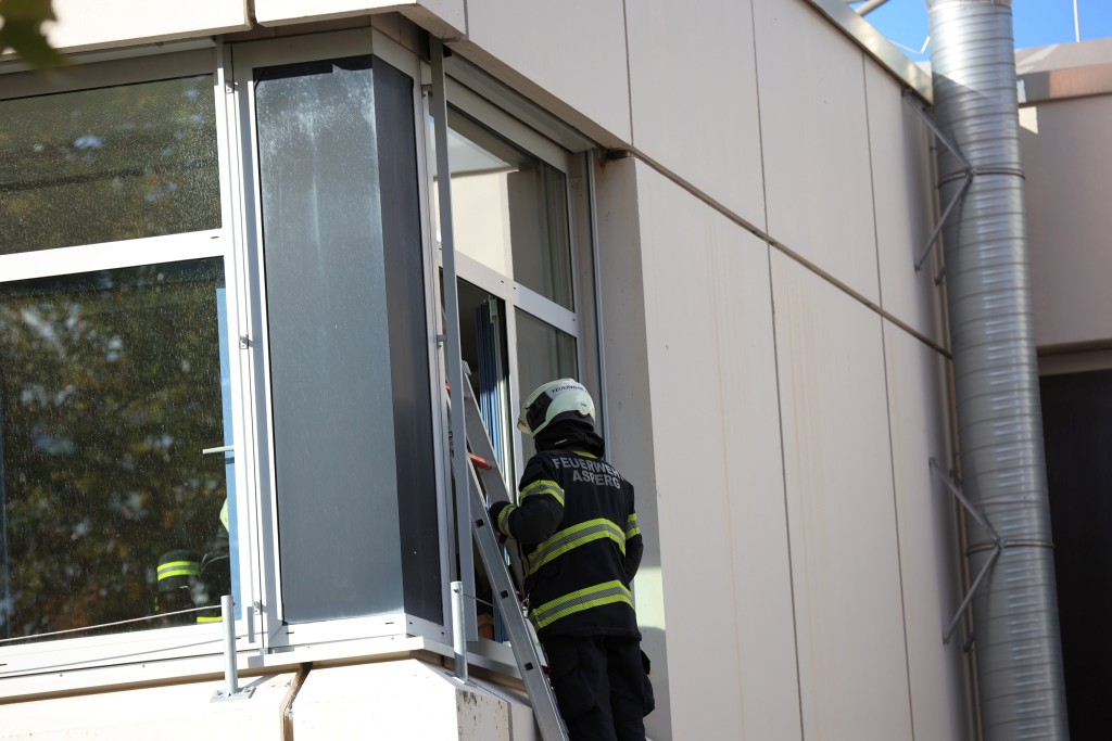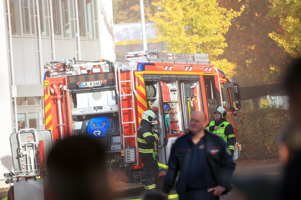 Das mittlerweile am Übungsort eingetroffene Hilfeleistungslöschgruppenfahrzeug 1 (HLF 1) erhielt die Aufgabe, die Menschenrettung und die Brandbekämpfung einzuleiten. Sofort gingen zwei Trupps mit jeweils einem Löschrohr unter schwerem Atemschutz in das Gebäude vor. Zeitgleich wurde die Rettung der Schüler in dem Klassenzimmer über eine tragbare Leiter vorbereitet. Zur Rettung der Arbeiter auf dem Dach wurde die Drehleiter der Feuerwehr Asperg in Stellung gebracht. Eine Rettung der Personen ist so schnell und relativ sicher möglich.