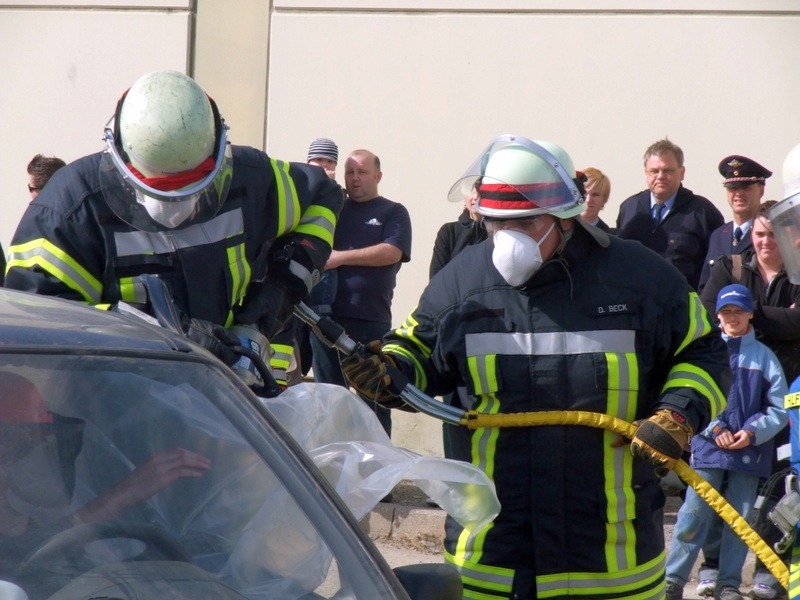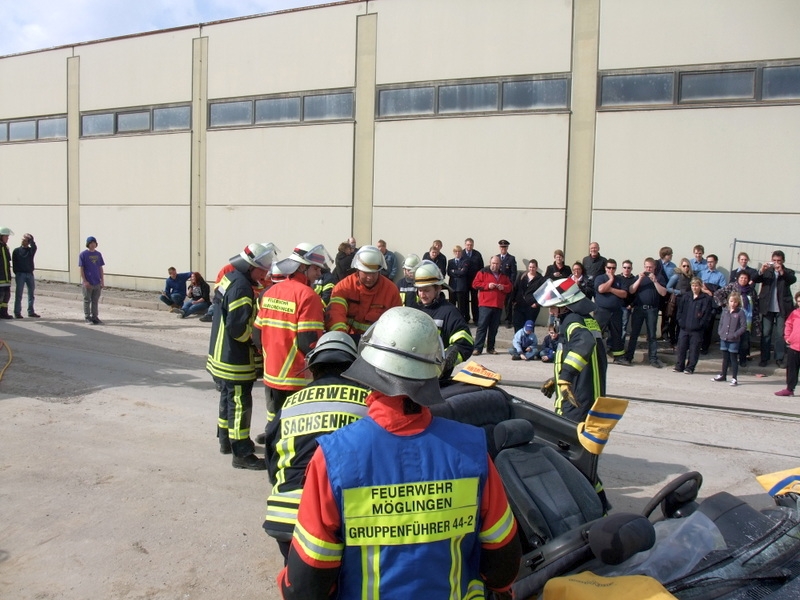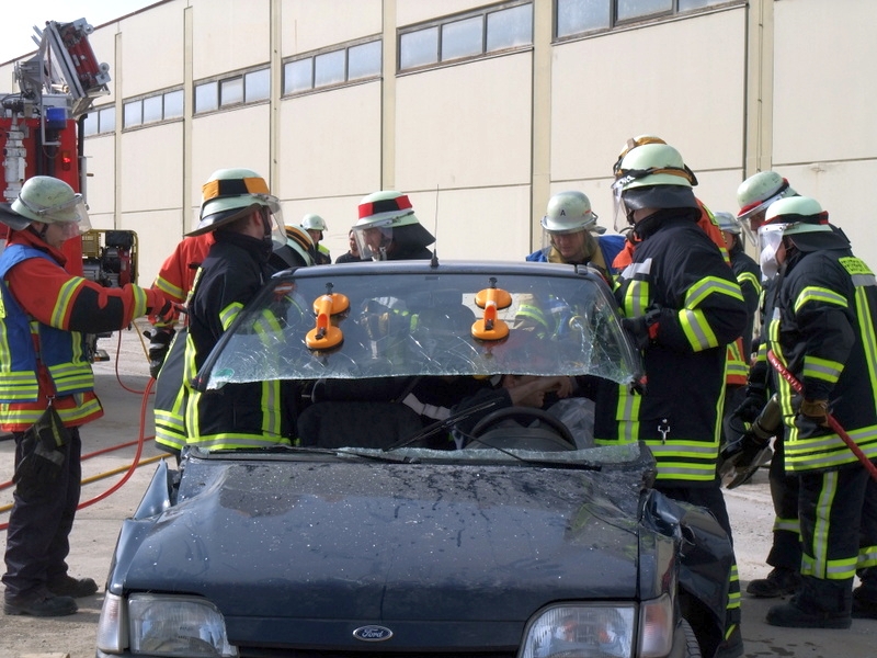 Die Abschlussübung gliederte sich in zwei Teile. Zuerst durfte eine Hälfte der Gruppe ihr Können bei einem simulierten Verkehrsunfall mit einer eingeklemmten Person unter Beweis stellen. Es galt die Patienten fachgerecht aus dem Autowrack zu schneiden, den Brandschutz sicherzustellen und den Verkehr abzusichern.