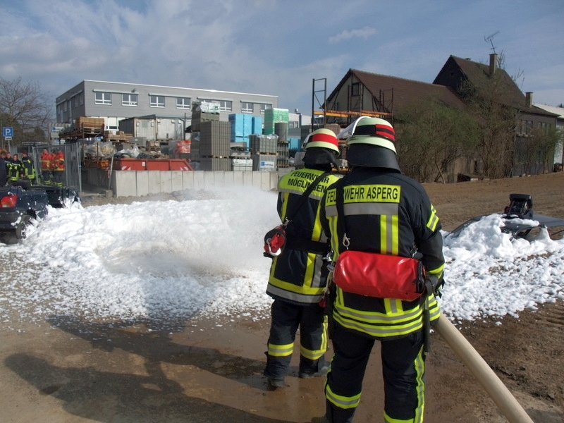 Im zweiten Übungsszenario wurde von einem brennenden PKW ausgegangen, den es mittels Löschschaums zu bekämpfen galt. Parallel wurde eine Person über tragbare Leitern gerettet. Auch dort zeigten die Teilnehmer ihr Können.