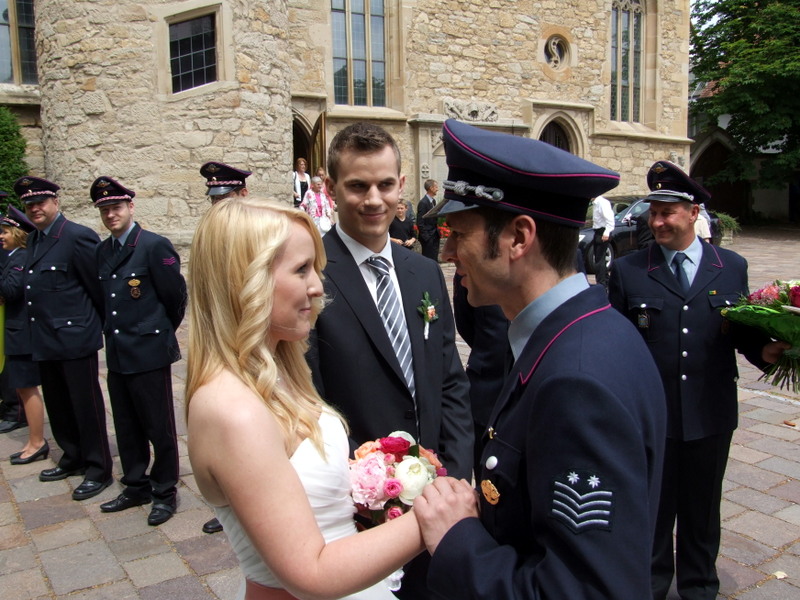 Hierbei ließ es sich die Feuerwehr Asperg nicht nehmen, für das Brautpaar Spalier zu stehen. Kommandant Stefan Fritz überbrachte die Glückwünsche der gesamten Wehr und übergab dem Brautpaar ein kleines Präsent.