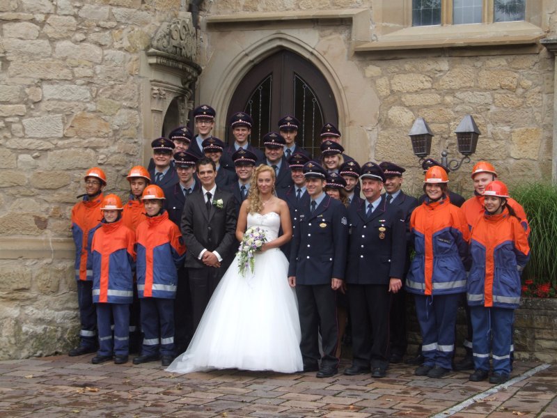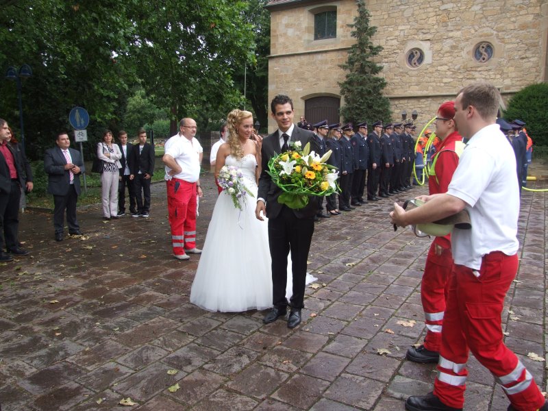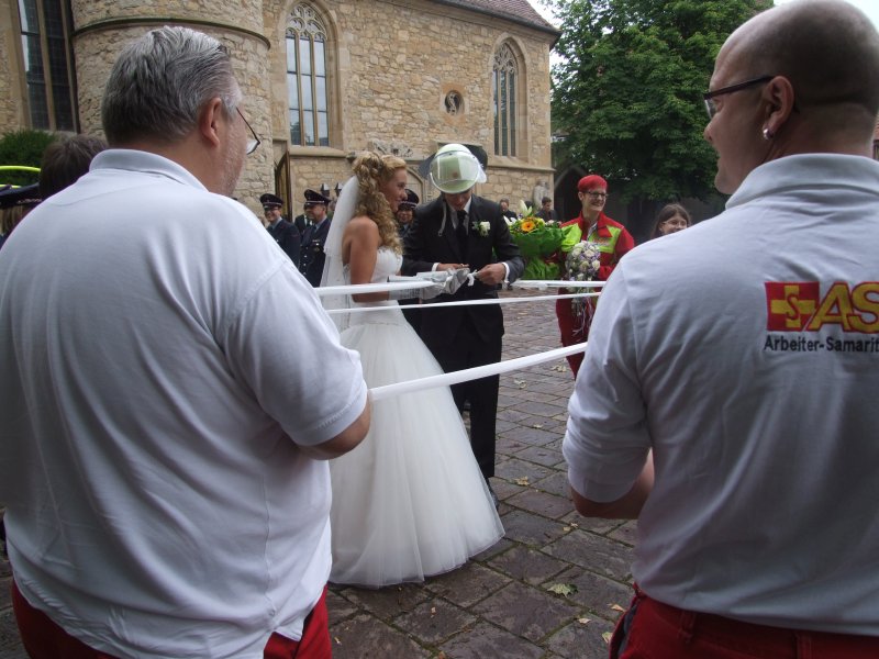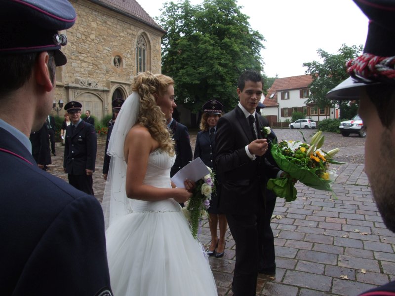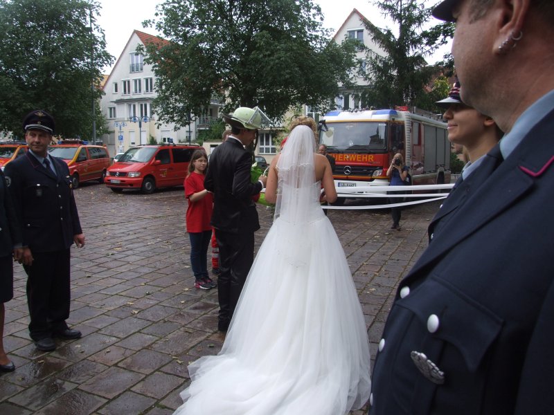 Die Feuerwehr Asperg ließ es sich nicht nehmen, für das Brautpaar Spalier zu stehen. Kommandant Stefan Fritz überbrachte die Glückwünsche der gesamten Wehr und übergab dem Brautpaar ein kleines Präsent.