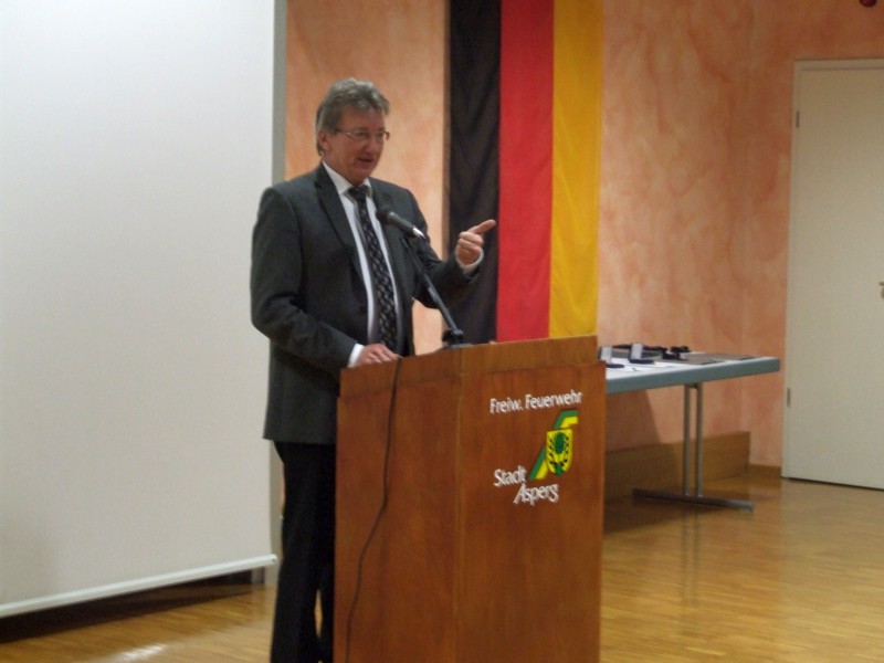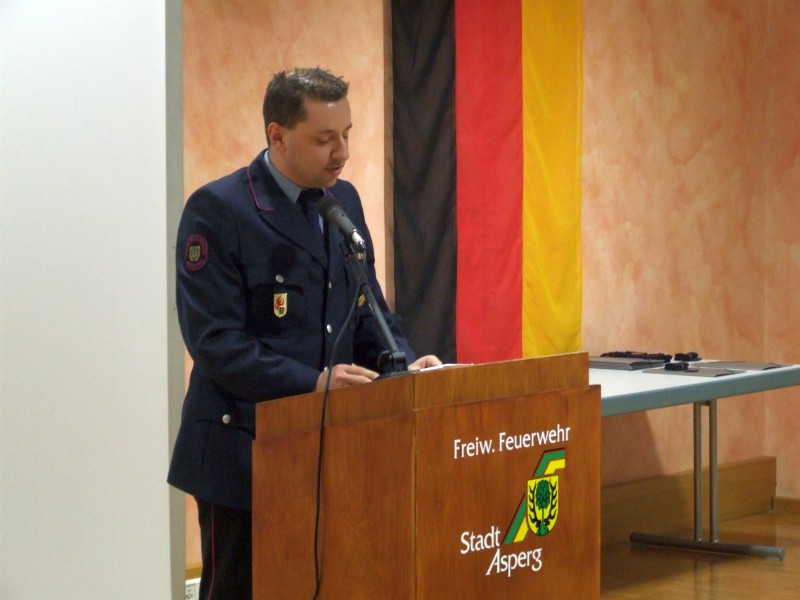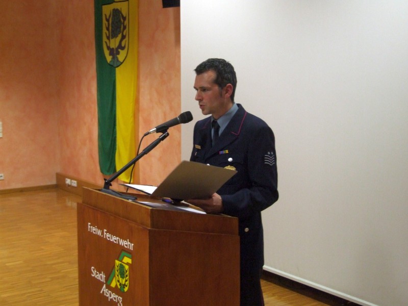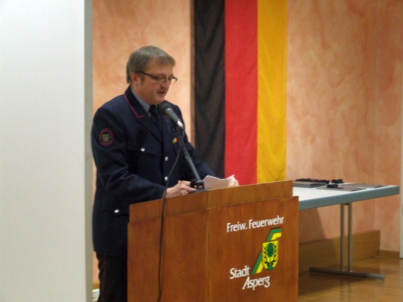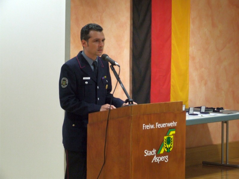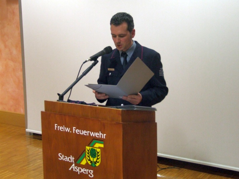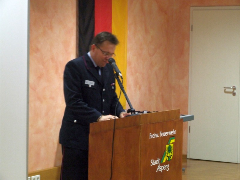 Im Anschluss an den Rückblick des Kommandanten folgte der Bericht des Ausbildungsleiter Michael Dahm. Er berichtete über die zahlreich absolvierten Fortbildungslehrgänge der einzelnen Feuerwehrleute und über 4200 Gesamtübungsstunden, die die 73 aktiven Feuerwehrleute in Asperg vergangenes Jahr geleistet hatten. Auch über die in Asperg, für die Feuerwehren des Landkreises Ludwigsburg abgehaltenen Ausbildungslehrgänge, erstattete Michael Dahm Bericht.