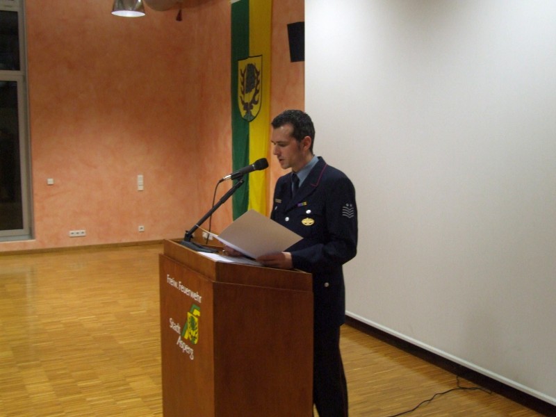 Aufgrund ihrer Leistung und nach Erfüllung der notwendigen Voraussetzungen wurden Daniel J., Lars Konzelmann, Hendrik Kuch, Justin Lippel, Melanie Rössler und Carsten von Oesen zum „Feuerwehrmann“ befördert. Zum „Oberfeuerwehrmann“ wurde Alex Duarte und zum „Löschmeister“ Roland Epple befördert.