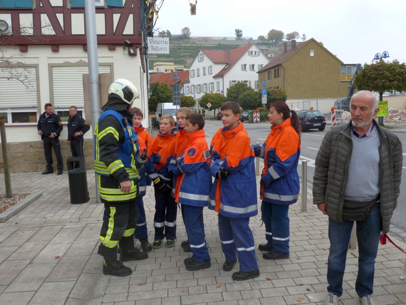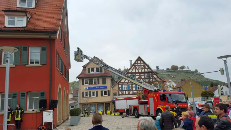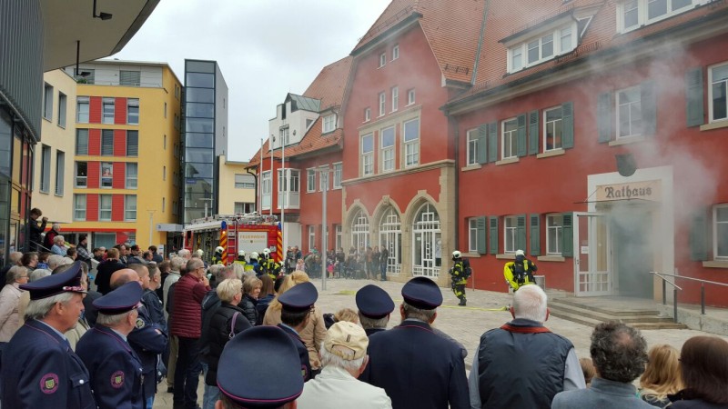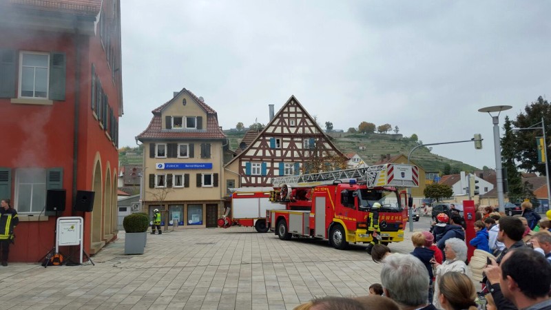 Kommandant Stefan Fritz moderierte die Übung und durfte unter den zahlreichen Gästen Vertreter des Gemeinderates, den Polizeiposten Asperg sowie als Vertreter der Stadtverwaltung Hauptamtsleiter Volker Gramlich am Marktplatz begrüßen. Die Einsatzleitung an dieser Übung hatte der stellvertretende Kommandant Michael Dahm.