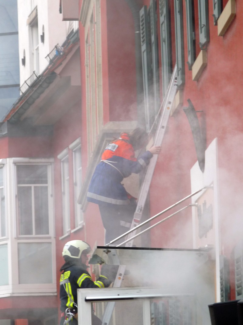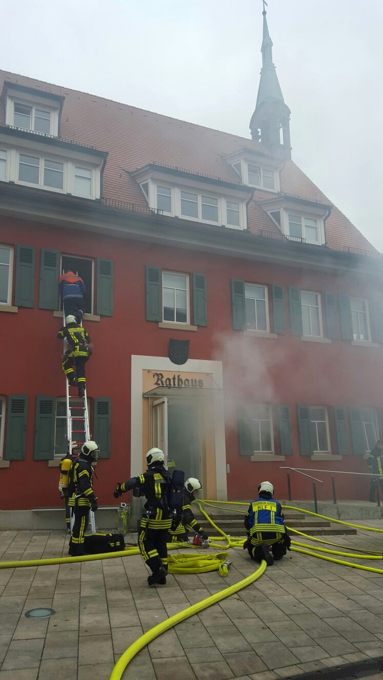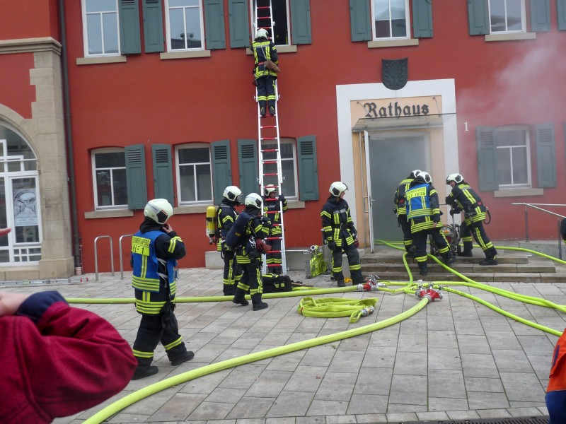 Folgendes Szenario wurde angenommen: In der Poststelle des Rathauses geriet ein Kopiergerät in Brand. Das Feuer breitete sich rasch aus. Die vom Hausmeister unternommen Löschversuche blieben ohne Wirkung. Er verständigte über Notruf 112 die Feuerwehr. Mehreren Beschäftigten des Rathauses war aufgrund der starken Rauchentwicklung der Fluchtweg abgeschnitten. Diese machten an den Fenstern, beim Eintreffen der Feuerwehr, auf sich aufmerksam.