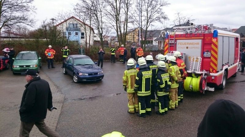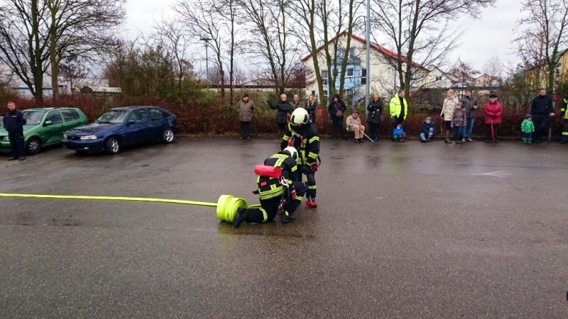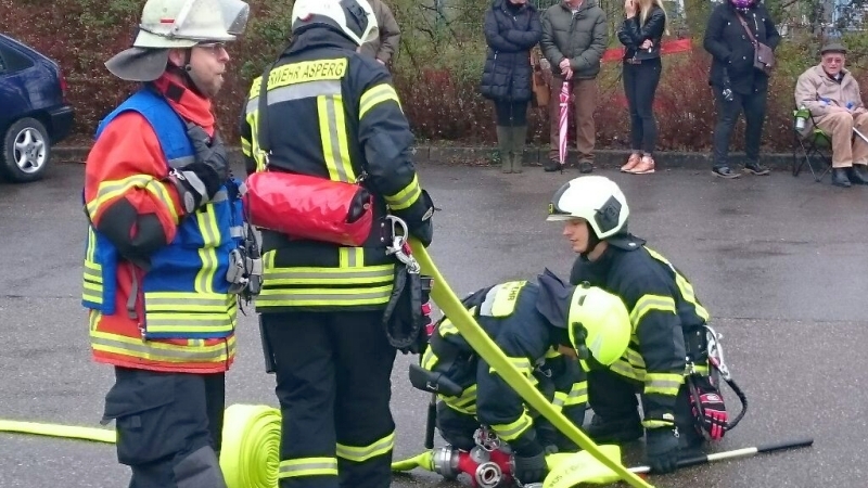 Insgesamt 23 Feuerwehranwärter aus den Feuerwehren des Landkreises, darunter 5 aus Asperg, zeigten ihr Können in verschiedenen Schauübungen. Den Zuschauern wurde gezeigt, wie eingeklemmte Personen mit verschiedenem Werkzeug, unter anderem dem hydraulischem Rettungsgerät, bestehend aus Schere und Spreizer, aus einem PKW befreit werden konnten. Zuvor wurde ein dreiteiliger Löschangriff mit Personenrettung über tragebare Leitern gezeigt. Die Wasserentnahme hierfür erfolgte via Saugschläuchen aus „offenem Gewässer“.
