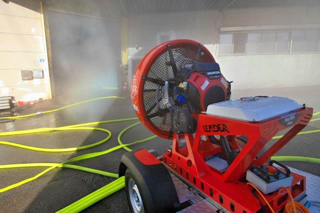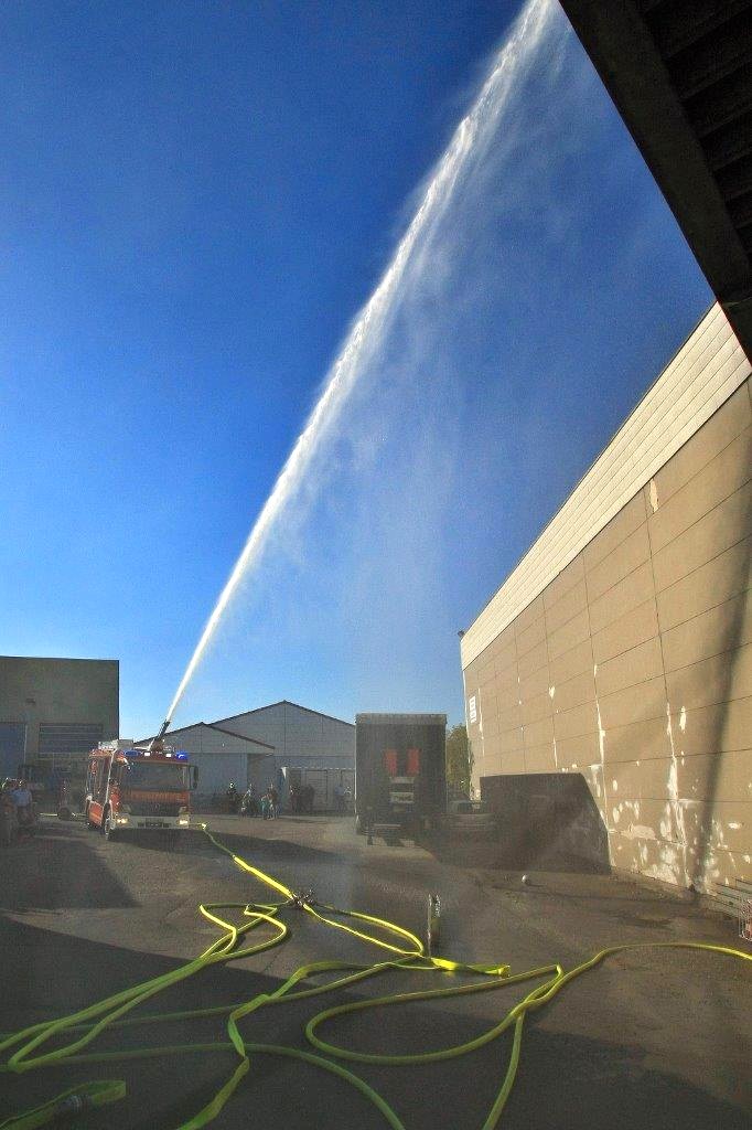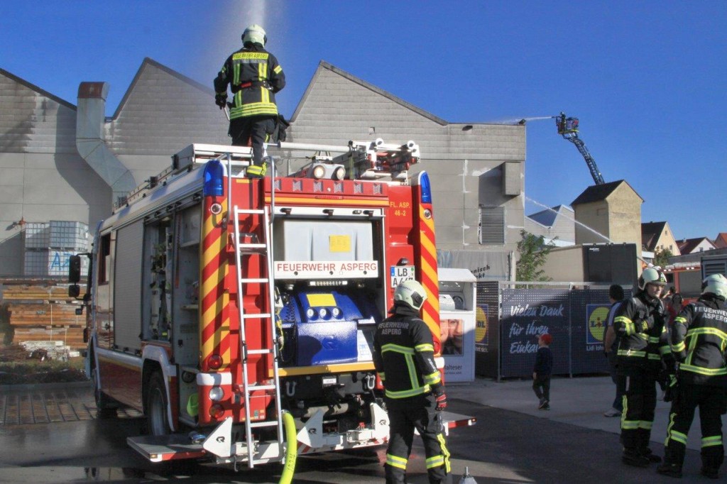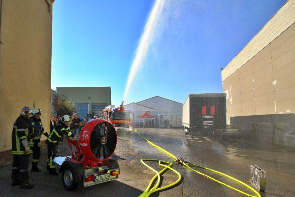 Parallel wurde eine umfangreiche Brandbekämpfung eingeleitet. Hierbei kamen zahlreiche Trupps unter schwerem Atemschutz mit mehreren C-Rohren im Innenangriff zum Einsatz. Von außen wurde mittels Wasserwerfern von zwei Hilfeleistungslöschfahrzeugen eine Riegelstellung gegen die Brandausbreitung aufgebaut. Mit dem mobilen Großlüfter der Feuerwehr Asperg wurde mit Entrauchungsmaßnahmen im Hallen inneren begonnen.