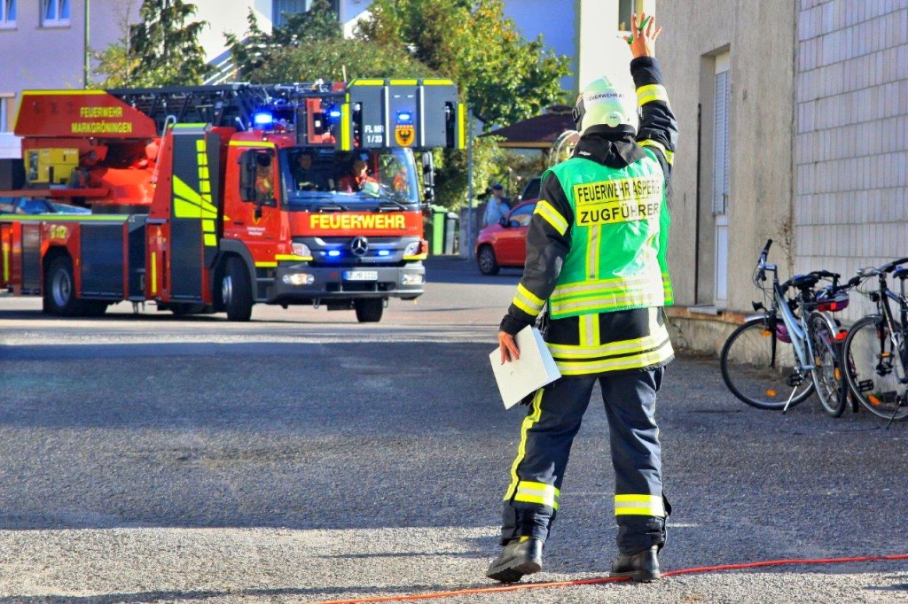 An den leerstehenden Hallen in der Markgröninger Straße wurde ein Gebäudebrand simuliert. Dichter Rauch quoll aus einer der Lagehallen. Zahlreiche Personen mussten vom Hallendach mittels Drehleiter gerettet werden. Diese wurden dann im Anschluss vom Rettungsdienst gesichtet und bei Bedarf medizinisch betreut.