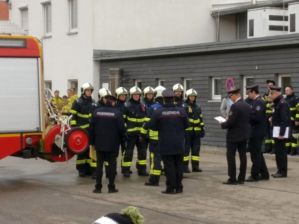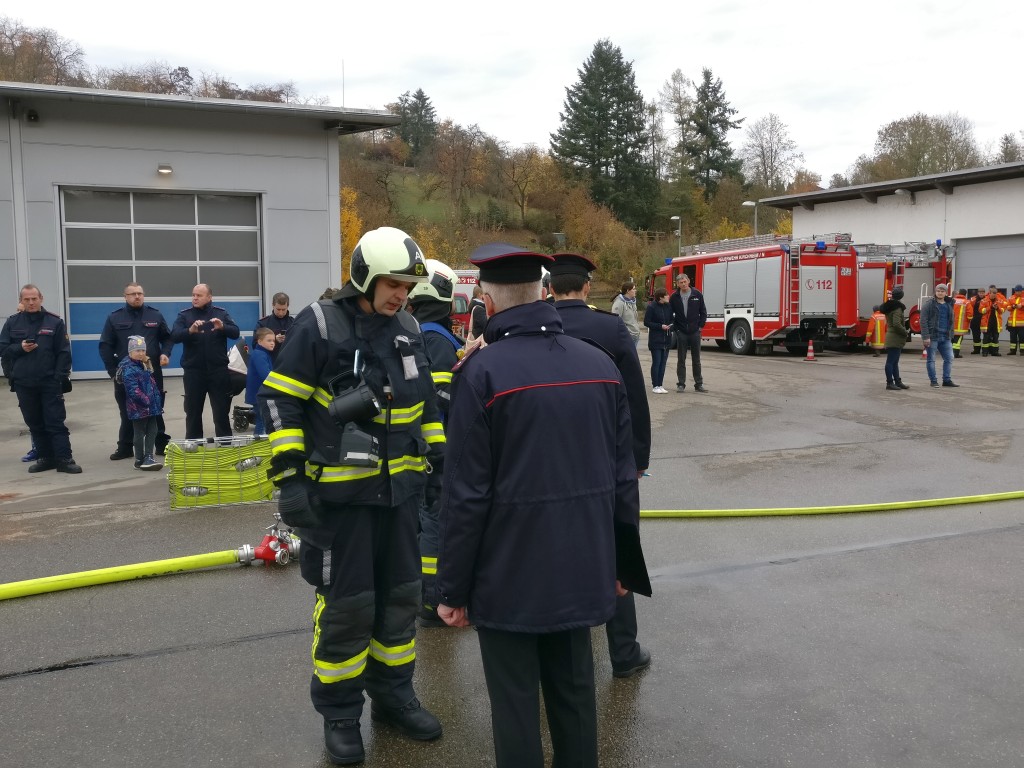 Zu den ersten Gratulanten in Remseck gehörten Kommandant Stefan Fritz und Stellvertreter Michael Dahm, die mit einer Abordnung von Angehörigen der Feuerwehr Asperg die Abnahme verfolgten.