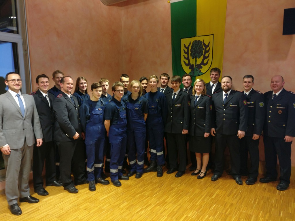 Bürgermeister Eiberger überreichte den Jugendlichen, als auch der LAZ Gruppe Gold um Roland Epple, feierlich die Ehrenabzeichen für ihre Uniformen.