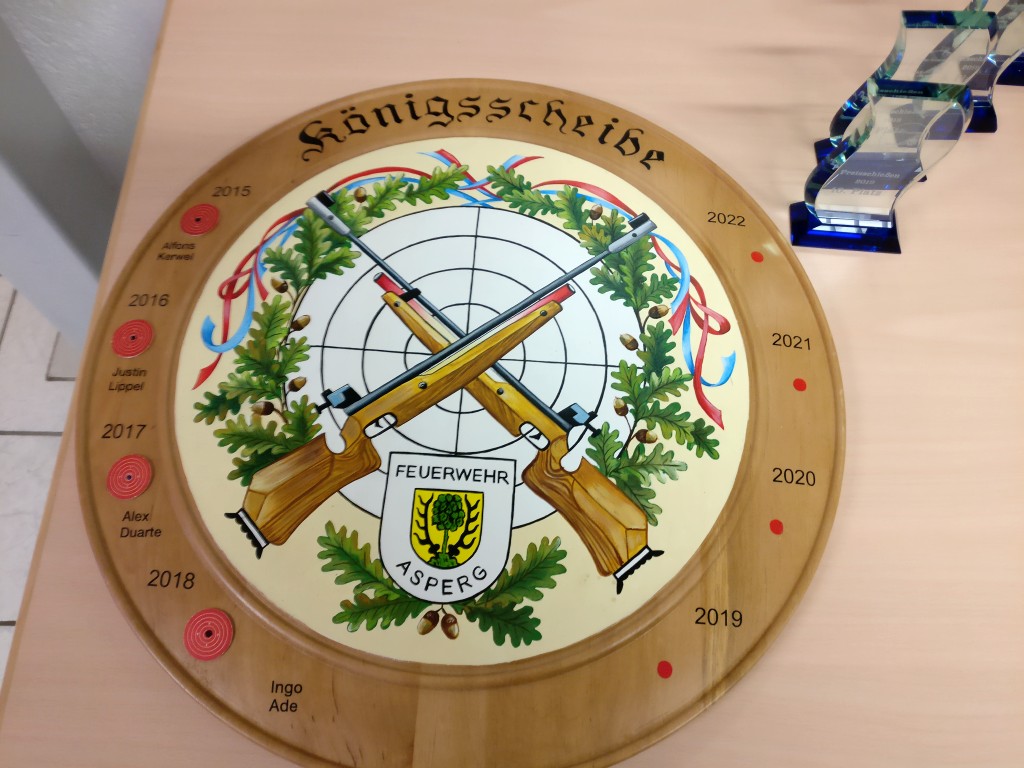 Beim zweiten Vergleich des Tages, dem Königsschießen, galt es den präzisesten Schuss in die Mitte einer Luftgewehrscheibe zu setzen. Bei dieser wahrlichen „Königsdisziplin“ hat jeder Teilnehmer lediglich drei Luftgewehrscheiben, auf die jeweils bloß einmal geschossen werden darf. Der präziseste Schuss gelang dieses Jahr Kommandant Stefan Fritz. Er schoss einen „Zehner“ und darf sich somit ein Jahr lang Schützenkönig der Feuerwehr Asperg nennen.