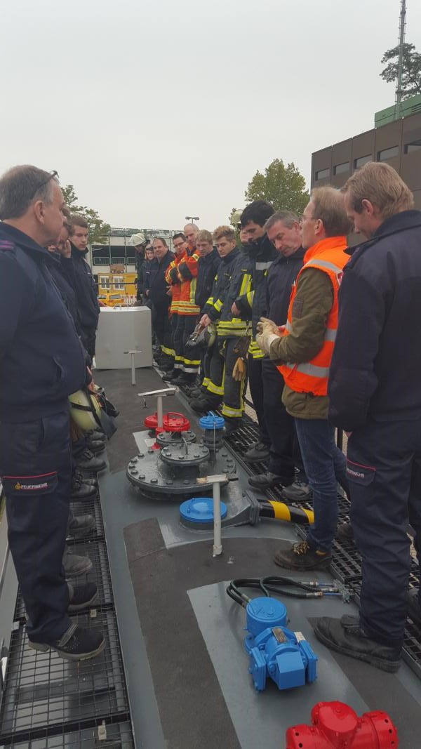 Letzter dient als Schulungsraum für die theoretische Unterweisung. Der erste Kesselwagen ist begehbarer und veranschaulicht die Funktion(-weise) der im Bahnverkehr verwendeten Domdeckeln, Befüll- und Entnahmeanschlüssen, Entlüftungen, Bodenventilen und sonstigen Armaturen. Der zweite Kesselwagen ist für praktische Übungen der Einsatzkräfte mit neun unterschiedlichen Leckagen versehen. Auslaufendes Medium wird hierbei durch Wasser simuliert. Unter anderem konnten im Rahmen der Übung Undichtigkeiten durch eine sogenannte Leckbandage, ein mit Druckluft aufblasbares Dichtkissen, das über dem Leck verspannt wird, erfolgreich verschlossen werden. Als Ausbilder standen zwei Mitarbeiter der DB-Notfalltechnik zur Verfügung.