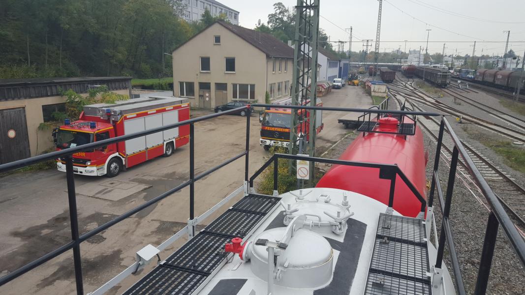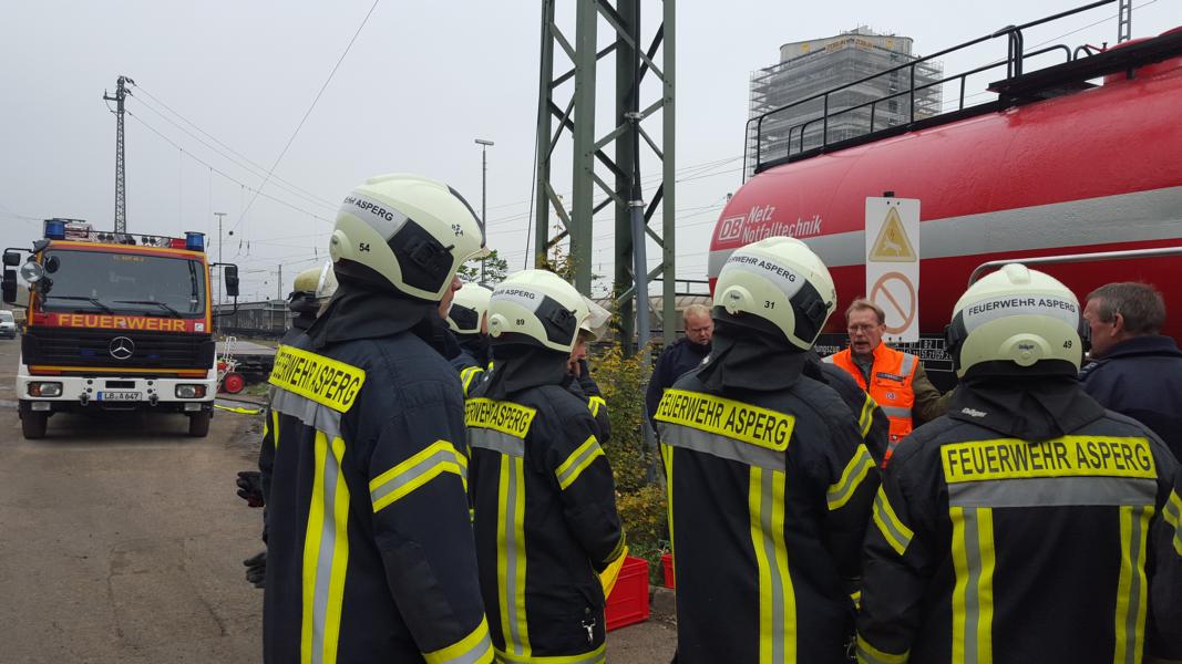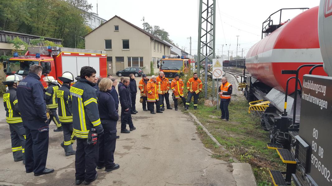 Unabhängig vom Einsatz des Gefahrstoffzugs am Rangierbahnhof Kornwestheim am Vorabend (19.10.2015), nahmen Einsatzkräfte am Dienstagvormittag an einer Gefahrgutausbildung der Deutschen Bahn (DB) am Stellwerk Bietigheim teil. Hiefür stellt die DB einen speziell für Gefahrgutlagen konzipierte Ausbildungszug, bestehend aus zwei Kesselwägen und einem Personenwagen, zur Verfügung.