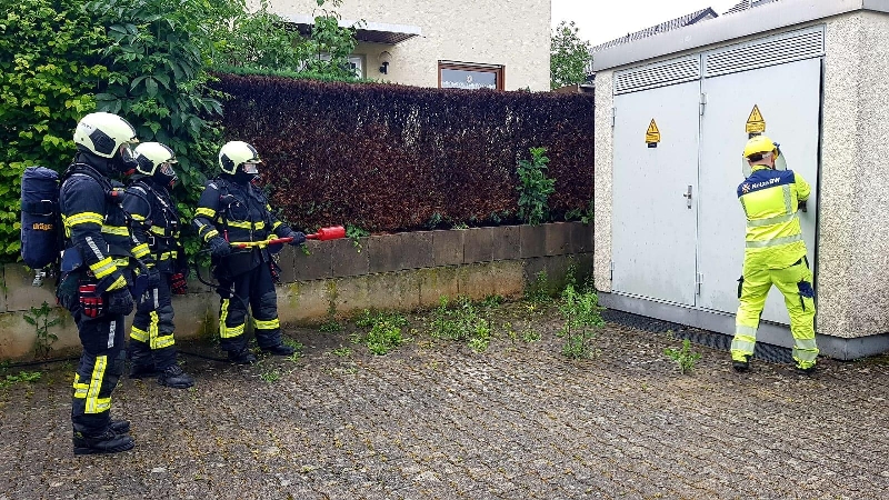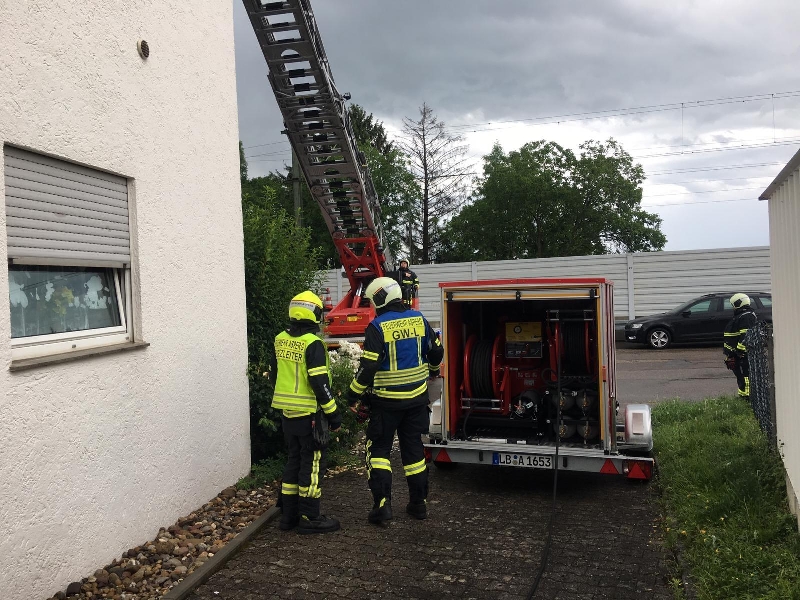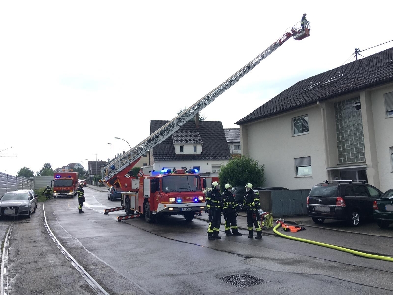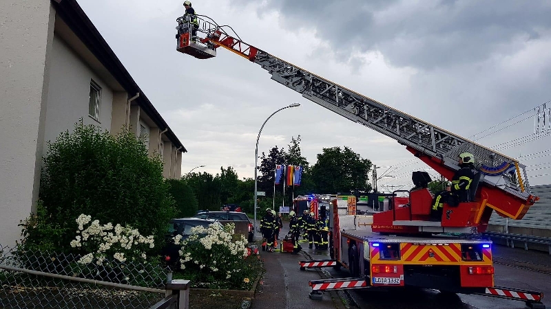 Fahrzeugaufgebot   Einsatzleitwagen (ELW 1)  Hilfeleistungslöschgruppenfahrzeug 1 (HLF 1)  Drehleiter (DLK 23/12)  Anhänger mit Sonderlöschmittel  Gerätewagen Logistik (GW-L 1) (a.D.)