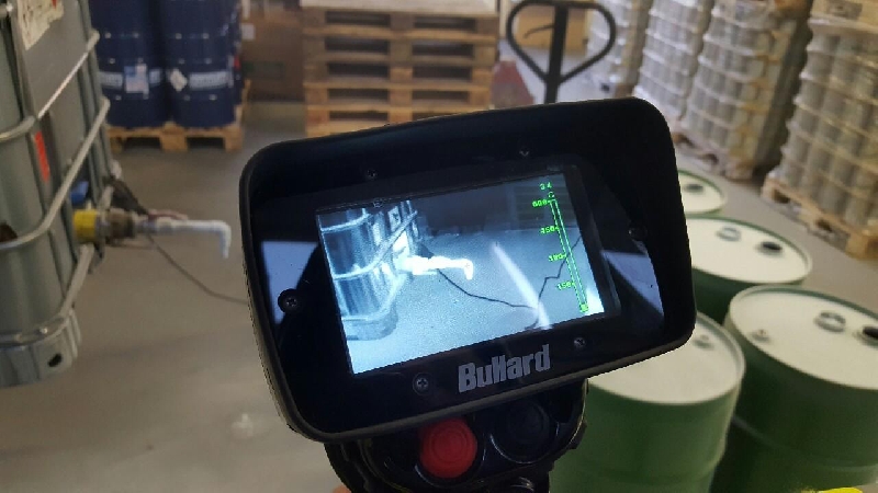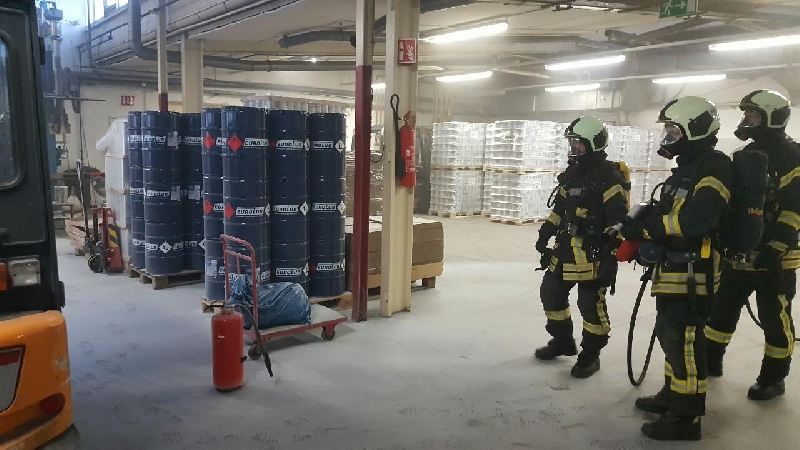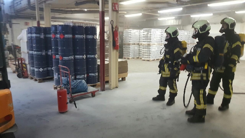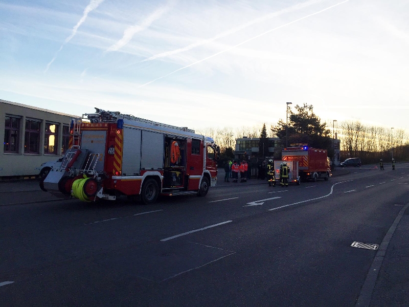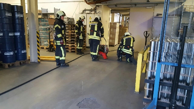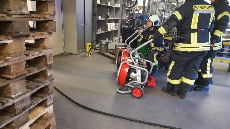 Bei einem Abfüllvorgang geriet ein IBC Behlter mit einer brennbaren Flüssigkeit in Brand. Das Feuer wurde mittels Pulver gelöscht. Umfangreiche Belüftungsmaßnahmen wurden durch die Feuerwehr durchgeführt.
