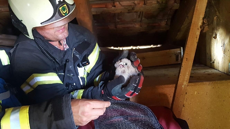 Bereits am Mittwoch wurde von aufmerksamen Bürgern ein flugunfähiger Falke im nördlichen Gebiet des Hohenasperg  gefunden. Den Passanten gelang es das Tier einzufangen. Sie verständigten die Falknerei in Beilstein. Das Tier wurde nach Beilstein zur Falknerei gebracht. Es wurde festgestellt, dass das Tier in einem sehr schlechten Zustand war. Von Spezialisten wurde das Tier die ganze Nacht hindurch „aufgepeppelt“ und von Hand gefüttert. Am Donnerstag Morgen hatte es sich zunehmend erholt. Es hatte jedoch weitere Verletzungen im Bereich des Schnabels. Die Falknerei Beilstein informierte daraufhin einen Spezialisten (vom Tierschutzbund Nabu) in Bad Friedrichshall. Am Donnerstag kam es dann im Laufe des Tages zur Kontaktaufnahme zwischen dem Spezialisten des Tierschutzbundes Nabu in Bad Friedrichshall, der Falknerei in Beilstein und der Feuerwehr Asperg.Da es sich um ein Weibchen handelte und aktuell Brutzeit bei Falken ist, wurde die Feuerwehr Asperg um Hilfe gebeten. Es gelang der Feuerwehr Asperg den verweisten Falken-Horst im Bereich des Hohenasperg ausfindig zu machen. Die Feuerwehr Asperg leitete umgehend die Tierrettung mit einer Steckleiter und Tieraufbewahrungsbox ein. Es konnten insgesamt alle fünf jungen Falken rechtzeitig gerettet werden. Die Fünf jungen Falken wurden von der Feuerwehr Asperg zur Falknerei in Beilstein gebracht. Hier konnten Sie den Spezialisten zur Behandlung übergeben werden. Eine „Familienzusammenführung“ ist somit gelungen.