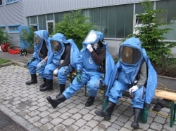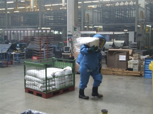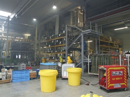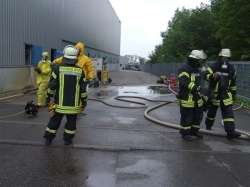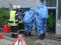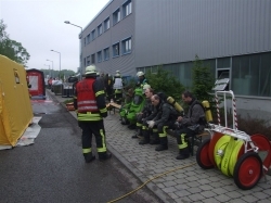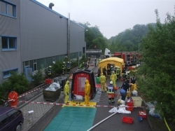 Am Freitag wurde die Feuerwehr Asperg nach Auslösung der automatischen Brandmeldeanlage zu einer Firma in die Siemensstraße alarmiert. Beim Eintreffen der ersten Einsatzkräfte an der Einsatzstelle stellte sich die Lage wie folgt dar: Eine zu diesem Zeitpunkt unbekannte Menge an Salzsäure war bei einem Befüllungsvorgang aus einem 17 000 Litertank ausgelaufen. Die Salzsäure reagierte sofort an der Luft. Die Dämpfe, die bei dem Ausgasungsprozess entstanden sind, hatten die Brandmeldeanlage ausgelöst. Umgehend wurde durch den Einsatzleiter der Feuerwehr Asperg auf das Alarmstichwort "Gefahrstoffunfall 3“ erhöht. Zwei Trupps unter schweren Chemikalien-Vollschutzanzügen gingen sofort zur Erkundung in die Produktionshalle der Firma vor. Parallel wurde zu der bereits vollständig geräumten Produktionshalle das nebenstehende Verwaltungsgebäude der Firma evakuiert. Bei der Erkundung bestätigte sich, dass eine große Menge an Salzsäure aus dem 17 000 Liter fassenden Tank ausgelaufen war und sich über den Tankraumboden im 2. Obergeschoss der Produktionshalle verteilte. Zudem lief bereits Salzsäure durch die Zwischendecke in das Erdgeschoss der Produktionshalle. Die Einsatzleitung ließ nun die Feuerwehr Vahingen mit dem zweiten Gefahrgutzug des Landkreises Ludwigsburg nachalarmieren. Die ausgelaufene Salzsäure wurde mittels Chemikalienbindemittel von mehreren Trupps unter Chemikalien-Vollschutzanzügen (CSA) eingedeicht. Weitere CSA-Trupps nahmen mittels Spezialgefahrstoffpumpe (ELRO-Gefahrgutpumpe GUP) und Flachsauger die ausgelaufene Salzsäure auf. Diese wurde in einen Auffangbehälter (IBC-Container) umgepumpt. Der Feuerwehr gelang es im weiteren Einsatzverlauf die letztlich rund 500 Liter ausgelaufene Salzsäure aufzunehmen und zu sichern. Bei diesen Arbeiten wurden insgesamt 32 schwere Chemikalien-Vollschutzanzüge und 46 leichte Chemikalien-Vollschutzanzüge eingesetzt. Während den Arbeiten stand der Pulverlöschcontainer LC 250 P zum Brandschutz in Bereitstellung. Durch einen Wasserwerfer wurden die ausgasenden Dämpfe niedergeschlagen. Umfangreich durchgeführte Luftmessungen um das Firmengelände herum blieben ohne erhöhte Werte. Eine Gefahr für die Bevölkerung bestand zu keinem Zeitpunkt. Um die Produktionshalle abschließend von den Salzsäuredämpfen frei zu bekommen wurde gegen Nachmittag die Werksfeuerwehr Bosch mit dem Großraumlüfter alarmiert. Zu den rund 70 Feuerwehrleuten waren während der Einsatzdauer die Polizei und der Rettungsdienst ebenfalls mit einem Großaufgebot vor Ort. Die Polizei leitete Ermittlungen zum Unfallhergang ein.