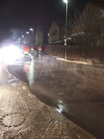 Am Montag wurde die Feuerwehr Asperg erneut mit dem Einsatzstichwort „Wasser im Gebäude“ alarmiert. In der Schwabenstraße kam es aufgrund der seit Tagen anhaltenden Kälte zu einem Wasserrohrbruch der Straßenleitung. Durch den enormen Wasseraustritt ist die Fahrbahndecke aufgebrochen. Das austretende Wasser ist in ein angrenzendes Wohnhaus geflossen. Dort sind zwei Kellerräume ca. 10 cm hoch vollgelaufen. Sie wurden durch die Feuerwehr Asperg mittels Wassersaugern leer gepumpt. Auf der Straße bildete sich durch das Wasser eine fast 5 cm dicke Blitzeisschicht. Bis zum Eintreffen des städtischen Winterdienstes wurde die Straße gesperrt. Eine Polizeistreife und der Notdienst der Stadtwerke waren ebenfalls vor Ort.