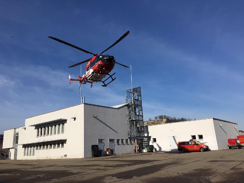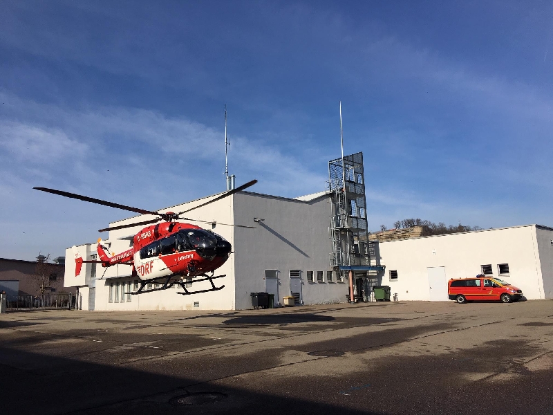 Landung Rettungshubschrauber (Christoph 51) am Feuerwehrgerätehaus Asperg. Notarztzubringer zum Einsatzort durch die Feuerwehr Asperg.