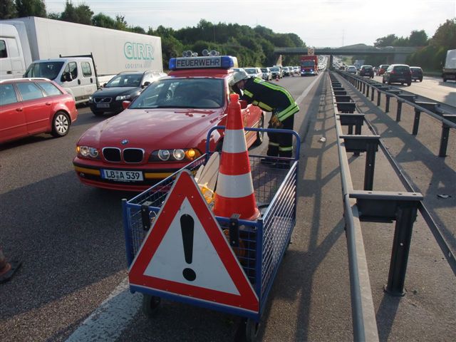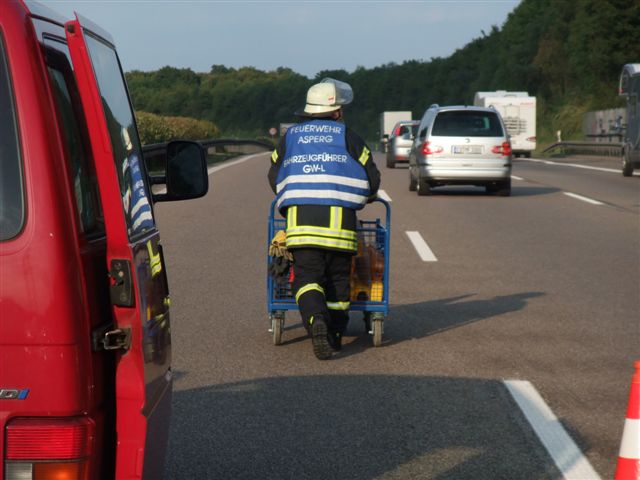Am Freitag wurde die Feuerwehr Asperg gemeinsam mit der Feuerwehr Ludwigsburg auf die Bundesautobahn A81 alarmiert. In Fahrtrichtung Heilbronn wurde ein PKW-Brand gemeldet. Beim Eintreffen der ersten Einsatzkräfte stellte sich heraus, dass kein PKW brannte. Auf dem linken Fahrstreifen kam es zu einem Auffahrunfall. Infolge des Unfalls liefen Betriebsmittel aus einem PKW. Diese erzeugten beim Verdampfen auf dem heißen Motorblock eine Rauchentwicklung. Die Unfallstelle wurde in Absprache mit der Autobahnpolizei abgesperrt. Die ausgelaufenen Betriebsmittel wurden durch die Feuerwehr mittels Bindemittel aufgenommen und die Fahrbahn gereinigt. Ebenfalls vor Ort war der Rettungsdienst mit einem Fahrzeug.