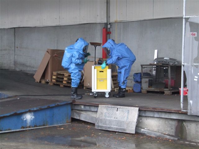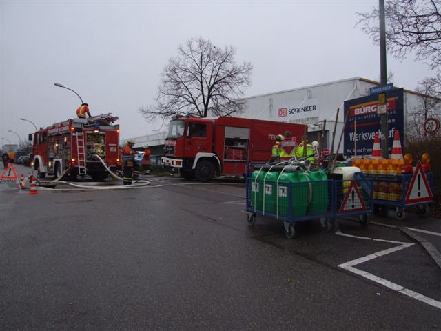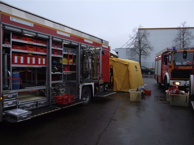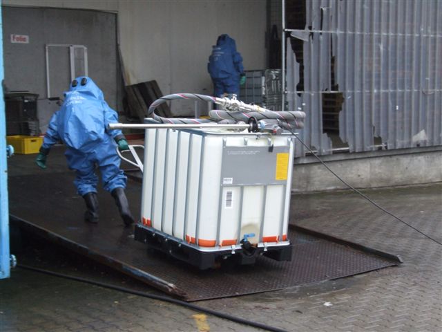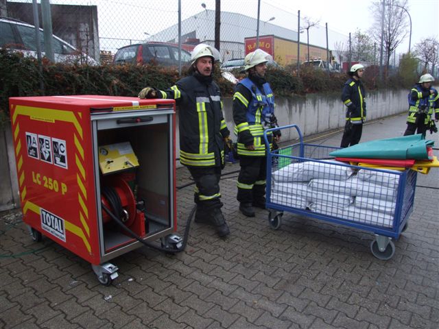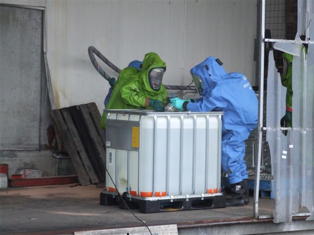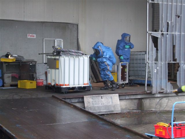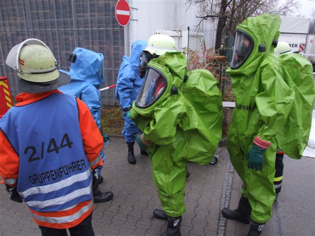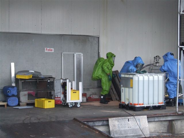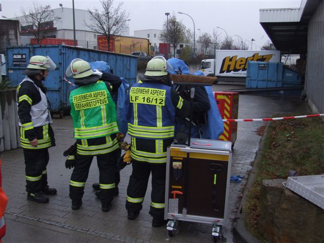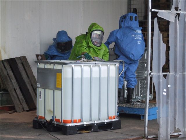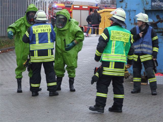 Am Dienstagmorgen wurde die Feuerwehr Asperg mit dem Gefahrgutzug zur Überlandhilfe nach Ditzingen alarmiert. Bei einer Firma in der Zeisstraße im Ditzinger Industriegebiet Ost wurde bei Verladearbeiten ein 1000 Liter fassender IBC-Behälter beschädigt. Der mit „Acetylaceton“ befüllte Behälter war leckgeschlagen und rund 100 Liter der giftigen und leicht brennbaren Flüssigkeit sind ausgelaufen. Umgehend wurde das ausgelaufene Medium mittels Chemikalienbindemittel von Trupps unter schweren Chemikalienvollschutzanzügen (CSA) abgebunden. Parallel wurde ein umfangreicher Brandschutz sichergestellt. Hier kam unter anderem der 250 kg ABC Pulver-Löschcontainer der Feuerwehr Asperg zum Einsatz. Im weiteren Einsatzverlauf wurde die Flüssigkeit aus dem verunfallten IBC-Behälter mittels Fasspumpe umgepumpt. Diese Arbeiten wurden ebenfalls unter schweren Chemikalienschutzanzügen durchgeführt. Der kaputte IBC-Behälter wurde an eine Fachfirma zur Entsorgung übergeben. Während des Einsatzes zeigte sich die überaus gute Zusammenarbeit der einzelnen Feuerwehren. Zum Unfallhergang leitete die Polizei Ermittlungen ein.