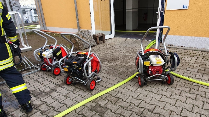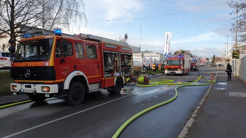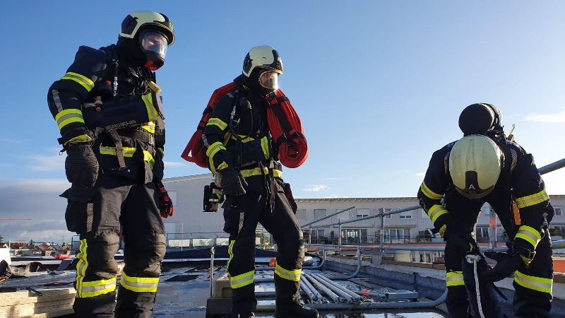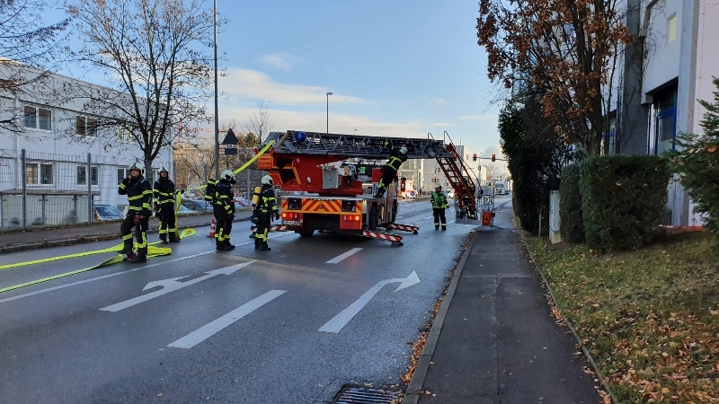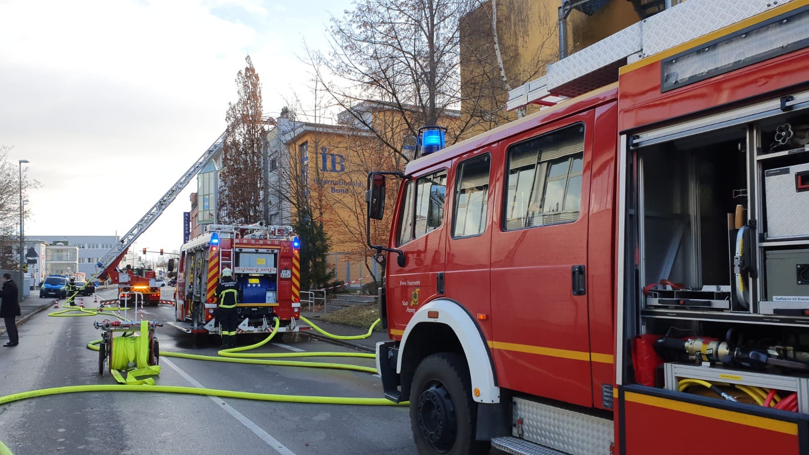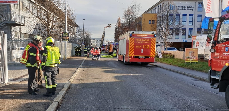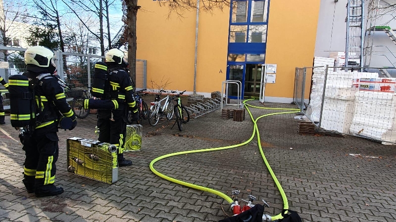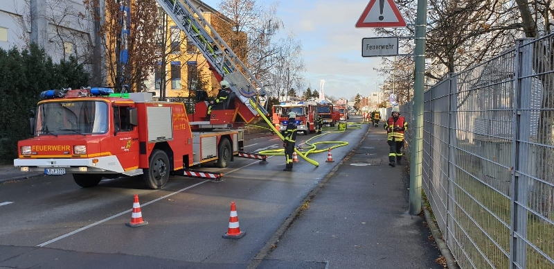 Bei Dacharbeiten geriet das Flachdach einer Schule in Brand. Zur Brandbekämpfung kamen mehrere C-Rohre im Innenenangriff und ein C-Rohr über die Drehleiter zum Einsatz.