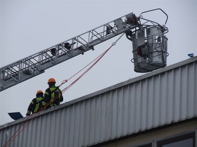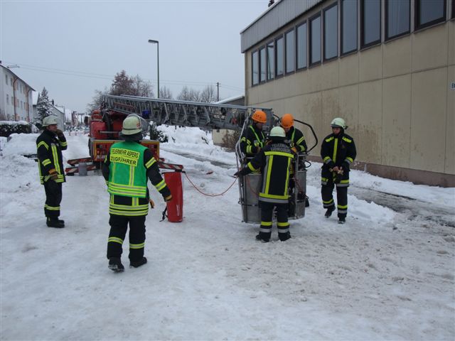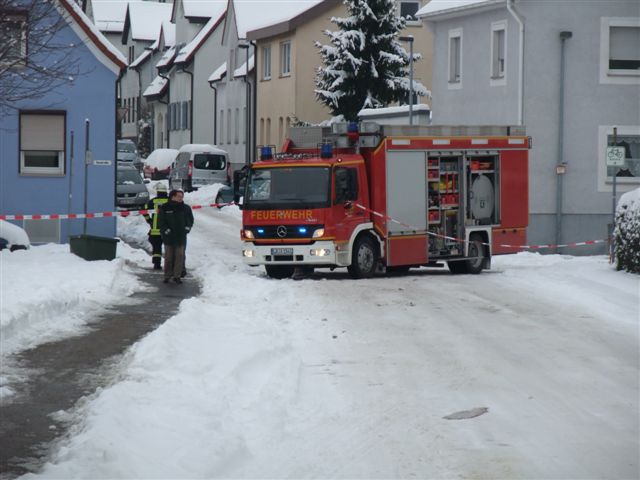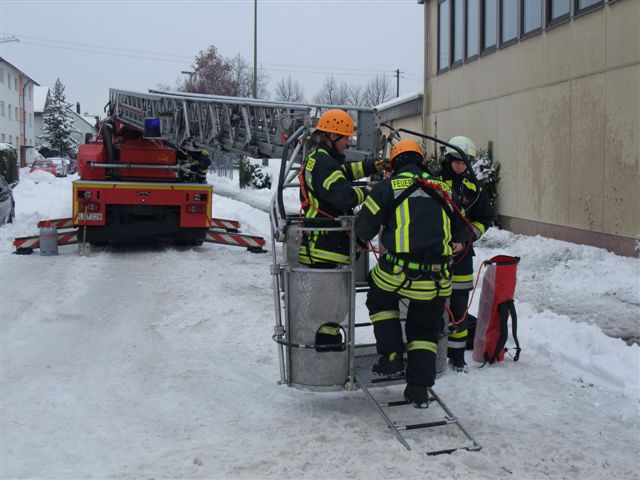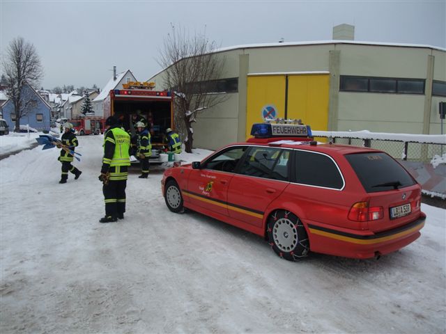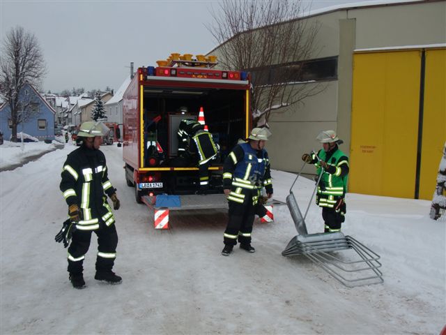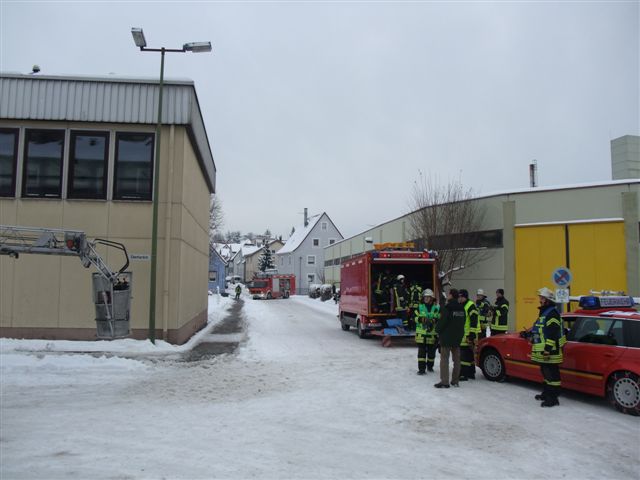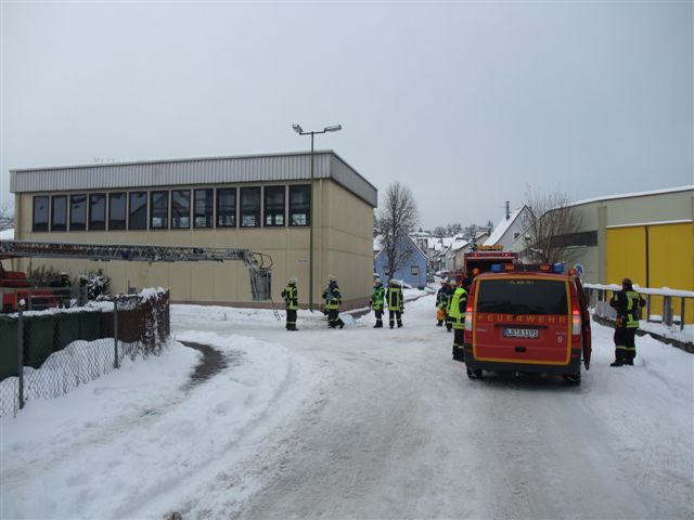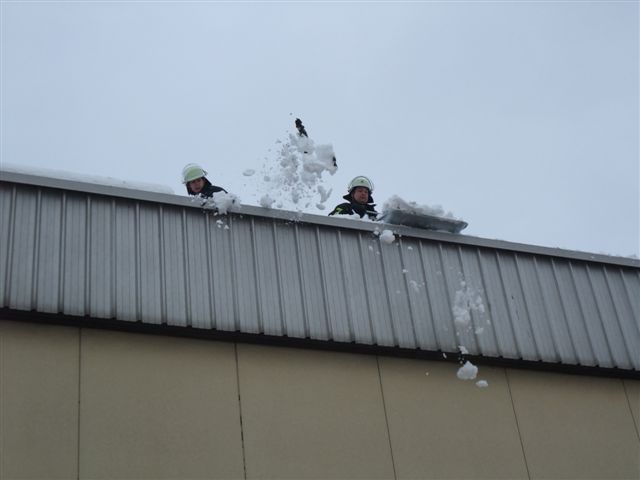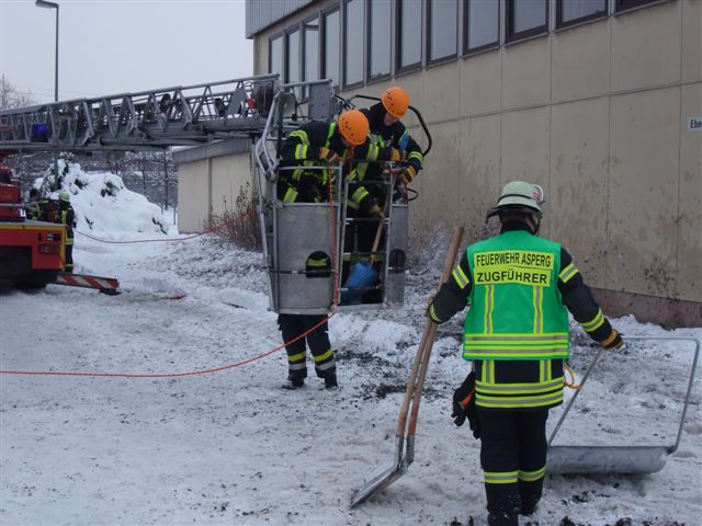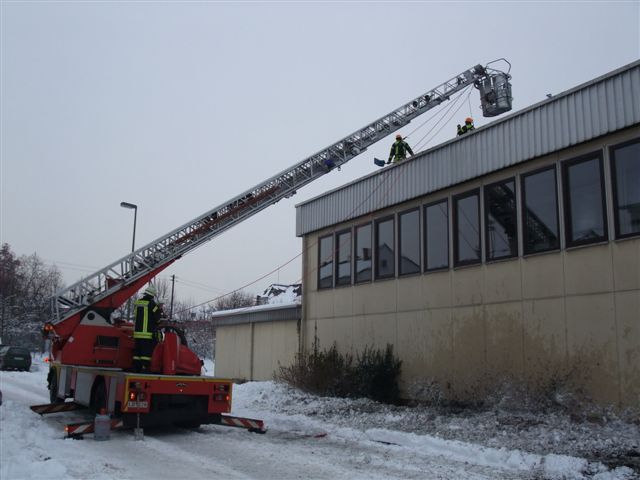 Am Dienstag wurde die Feuerwehr Asperg erneut von der städtischen Verwaltungsführung zur Räumung eines Hallendachs von Schneelast alarmiert. Das Hallendach der städtischen Kleinturnhalle in der Augustenstraße hatte den Schneelast-Grenzwert ebenfalls erreicht. Von der Feuerwehr Ludwigsburg wurde eine Drehleiter durch den Einsatzleiter alarmiert. Die rund 480 m² große Dachfläche wurde durch die Einsatzkräfte geräumt. Hier kamen zwei Absturzsicherungen zur Sicherung der an der Dachkante arbeitenden Trupps zum Einsatz. Im Bereich um die Kleinturnhalle kam es aufgrund von Straßensperrungen zu Verkehrsbehinderungen. Vor Ort war die Polizei mit einer Streife. Ein Bild von der Einsatzstelle machten sich der Erste Beigeordnete Manfred Linder und ein Fachingenieur vom städtischen Bauamt.
