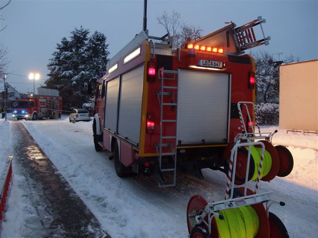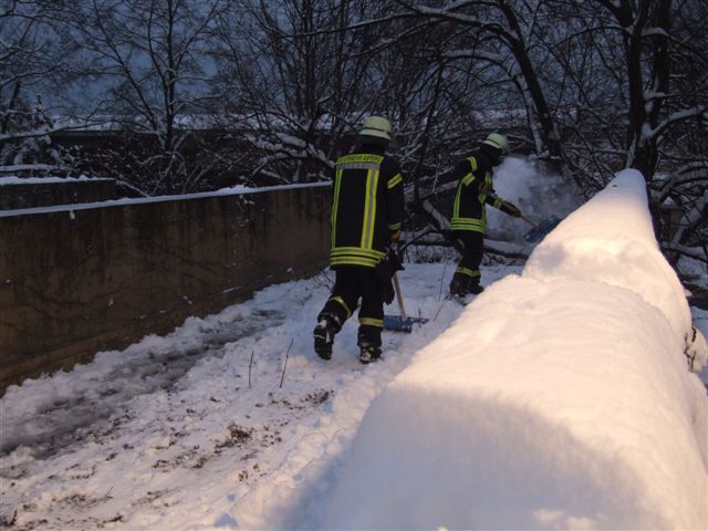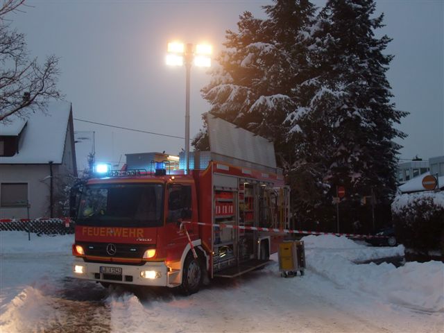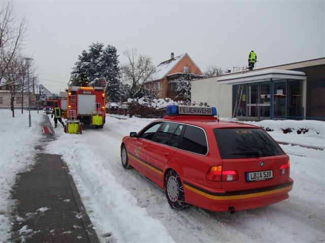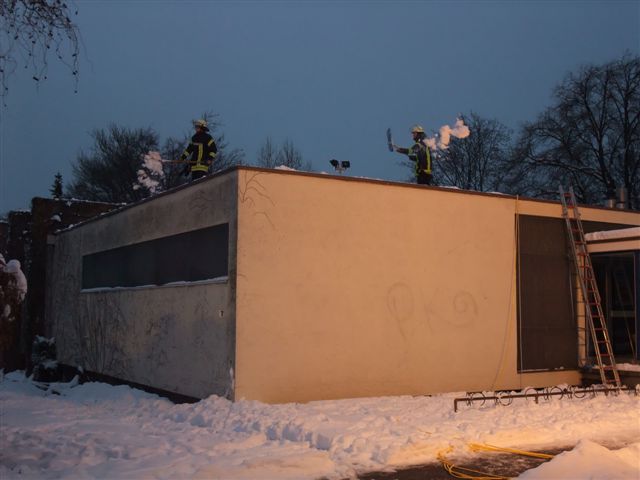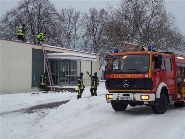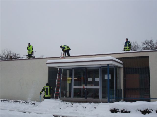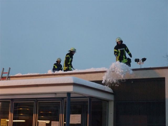 Parallel zu den Arbeiten an der Kleinturnhalle musste das Dach der städtischen Lehrschwimmhalle geräumt werden. Berechnungen der Statik hatten ergeben vorsichtshalber auch diese rund 560 m² große Dachfläche abzuräumen. Während der Räumarbeiten musste die Carl-Diem-Straße voll gesperrt werden. Aufgrund der anbrechenden Dunkelheit wurde die Einsatzstelle weiträumig ausgeleuchtet.