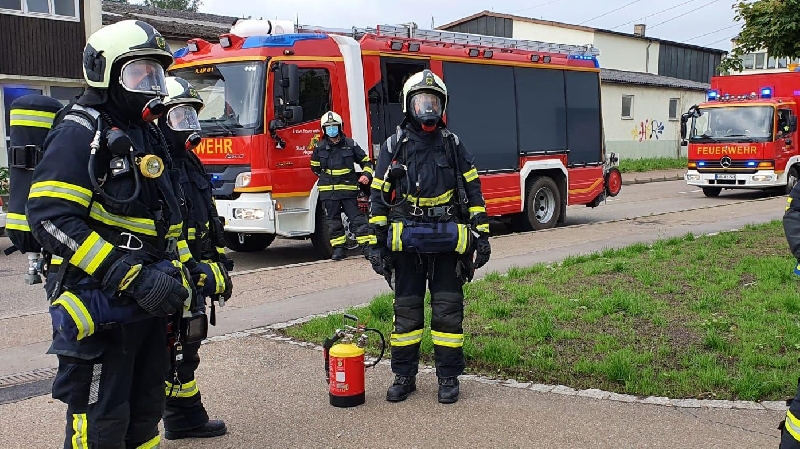 Fahrzeugaufgebot   Einsatzleitwagen (ELW 1)  Hilfeleistungslöschgruppenfahrzeug 1 (HLF 1)  Hilfeleistungslöschgruppenfahrzeug 2 (HLF 2)  Drehleiter (DLK 23/12)  Anhänger mit Sonderlöschmittel  Gerätewagen Logistik (GW-L 1) (a.D.)