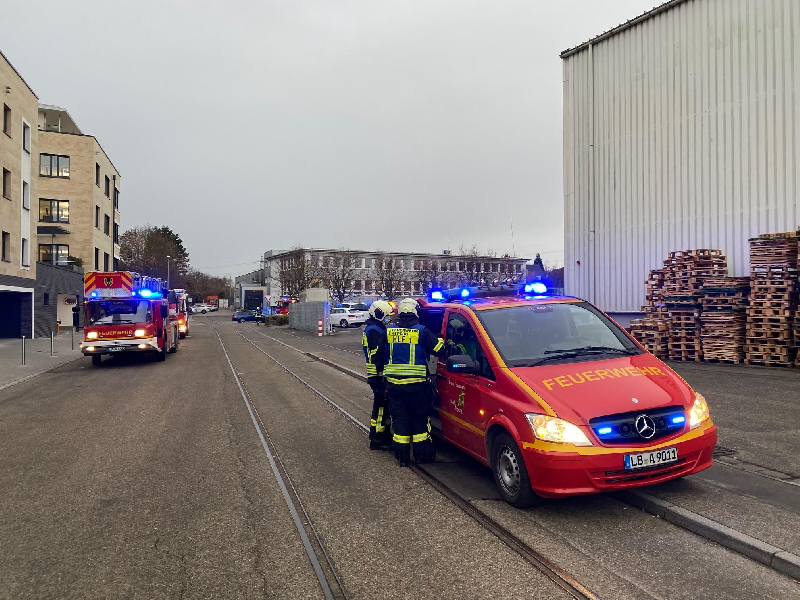 Fahrzeugaufgebot   Einsatzleitwagen (ELW 1)  Hilfeleistungslöschgruppenfahrzeug 1 (HLF 1)  Hilfeleistungslöschgruppenfahrzeug 2 (HLF 2)  Drehleiter (DLK 23/12)  Anhänger mit Sonderlöschmittel  Gerätewagen Logistik (GW-L 1) (a.D.)