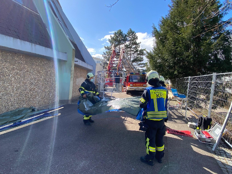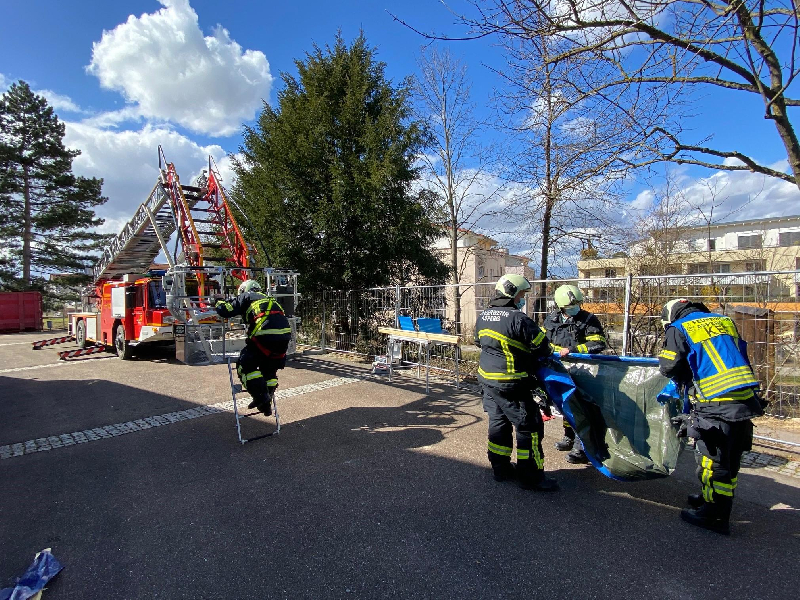 Fahrzeugaufgebot   Kommandowagen (KdoW)  Einsatzleitwagen (ELW 1)  Drehleiter (DLK 23/12)  Kleineinsatzfahrzeug (KEF)