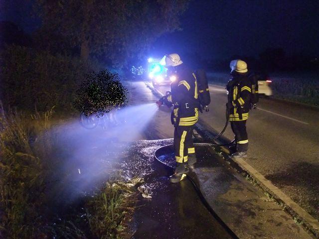 Am Montag wurde die Feuerwehr Asperg um 21:59 Uhr zu einem Flächenbrand in die Markgröninger Straße alarmiert. Die Einsatzstelle befand sich jedoch nicht in der Markgröninger Straße sondern unmittelbar am Fahrbahnrand an der Landesstraße L1138 in Fahrtrichtung Markgröningen. Der Flächenbrand erstreckte sich auf lediglich rund fünf Quadratmeter. Der Brand wurde mittels „Schnellangriff Wasser“ abgelöscht. Angrenzende Büsche wurden vorsorglich gewässert. Die Polizei leitete Ermittlungen zum Brandhergang ein.