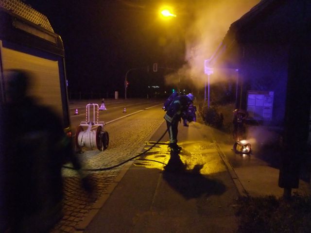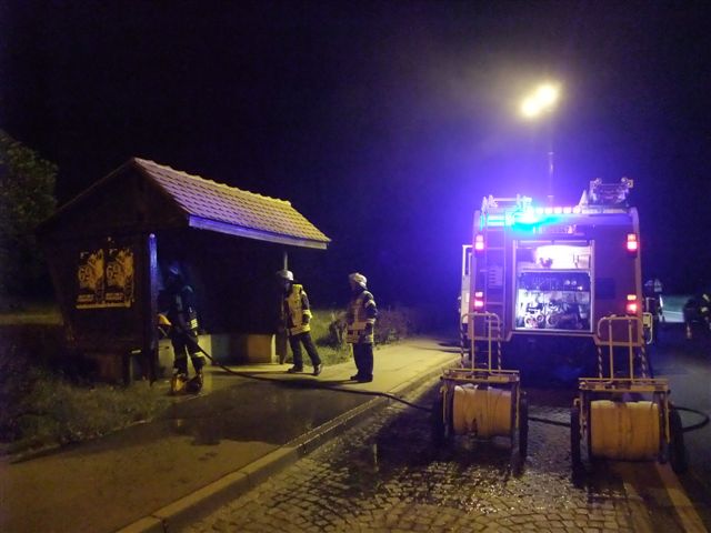 Rund eineinhalb Stunden nach dem zweiten Einsatz an diesem Tag befanden sich das Löschgruppenfahrzeug und der Kommandowagen auf der Heimfahrt vom Feuerwehrfest in der Nachbarkommune Markgröningen. Auf Höhe des Behindertenheims Markgröningen kamen die Einsatzkräfte aus Asperg zu einem brennenden Mülleimer an einem Buswartehaus. Das Feuer hatte bereits auf die Seitenverkleidung des Buswartehauses übergegriffen. Da sich der Brand auf Markgröninger Gemarkung befand ließ der Kommandanten der Feuerwehr Asperg die Feuerwehr Markgröningen alarmieren. Parallel hierzu wurde mit Löscharbeiten begonnen. Hier kam ein Trupp unter Atemschutz mit dem „Schnellangriff Wasser“ zum Einsatz. Die Polizei leitete Ermittlungen zum Brandhergang ein. An der Einsatzstelle vor Ort war ebenfalls die Feuerwehr Markgröningen mit einem Tanklöschfahrzeug.