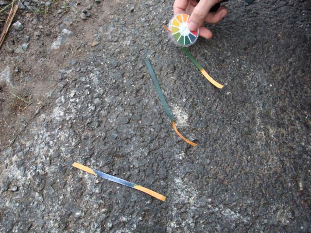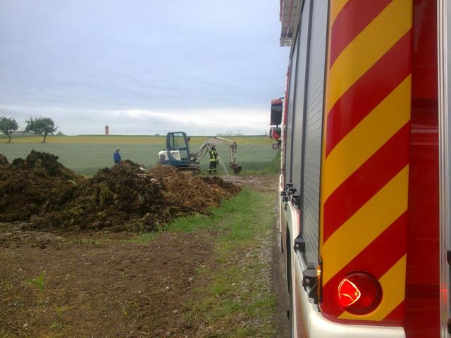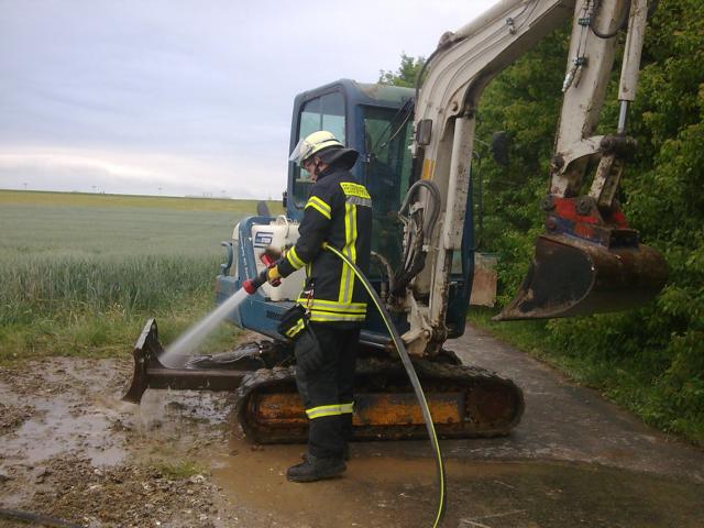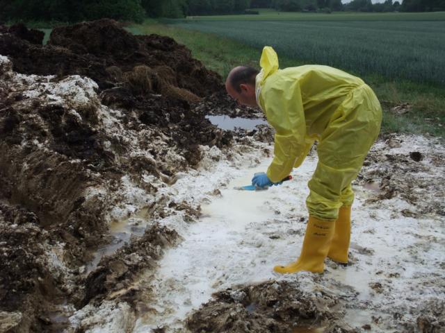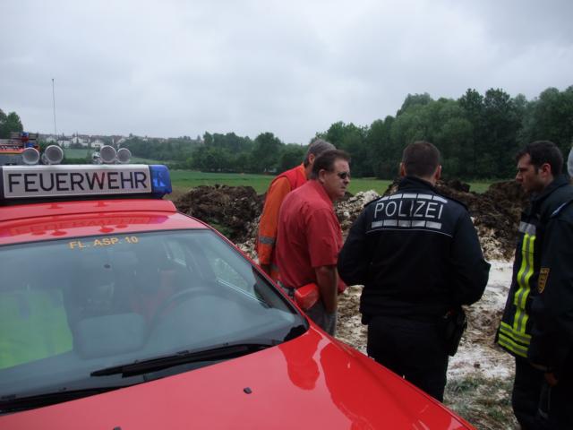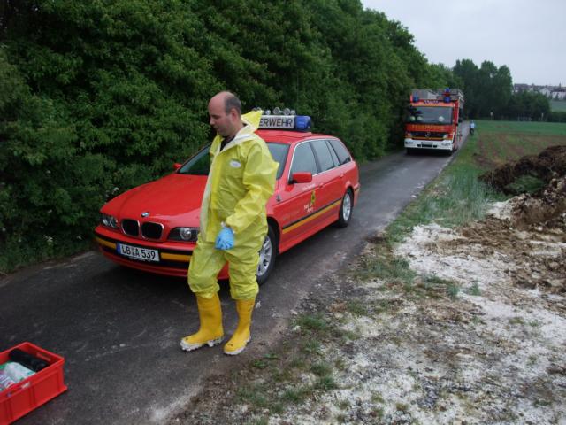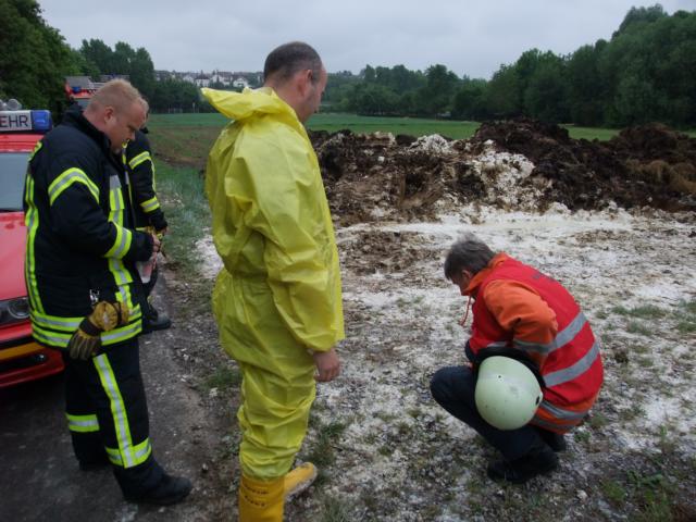 Am Mittwoch wurde die Feuerwehr Asperg zu einem Acker im Gewann „Heckenwiesen“ alarmiert. Die Polizei forderte die Feuerwehr zu Bodenmessungen an. Abgelagerter Branntkalk hatte durch Starkregen mit Wasser reagiert und hatte stark ätzendes Calciumhydroxid gebildet. Dies bestätigten Messungen, die in Absprache mit dem ebenfalls alarmierten Fachberater Chemie des Landkreises Ludwigsburg durchgeführt wurden. Die Bodenmessungen ergaben pH-Werte zwischen 12 - 14 (pH-Wert 14 = höchster zu messender basischer Wert). Das Umweltschutzamt des Landratsamt Ludwigsburg ordnete an, den verseuchten Boden durch eine Spezialfirma abtragen zu lassen. In Absprache mit der Polizei wurde während der Erdarbeiten das betroffene Gebiet weiträumig durch die Feuerwehr abgesperrt. Nach Abschluß der Erdarbeiten wurde der angrenzende Feldweg und die eingesetzten Baumaschienen durch die Feuerwehr Asperg ausgiebig mit Wasser neutralisiert und gereinigt. Die Polizei leitete Ermittlungen ein.