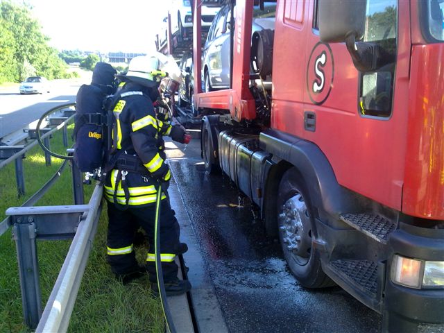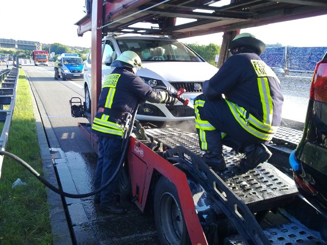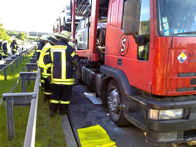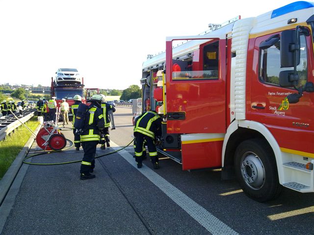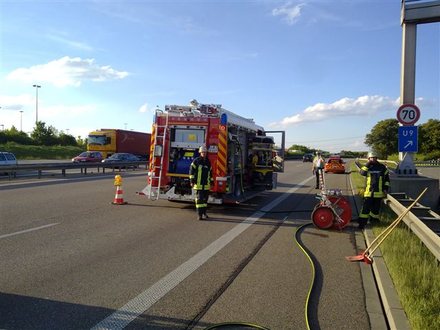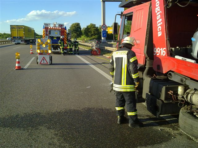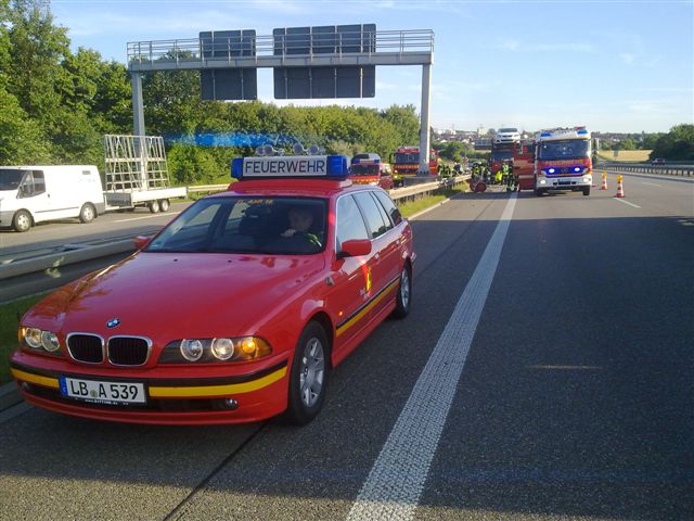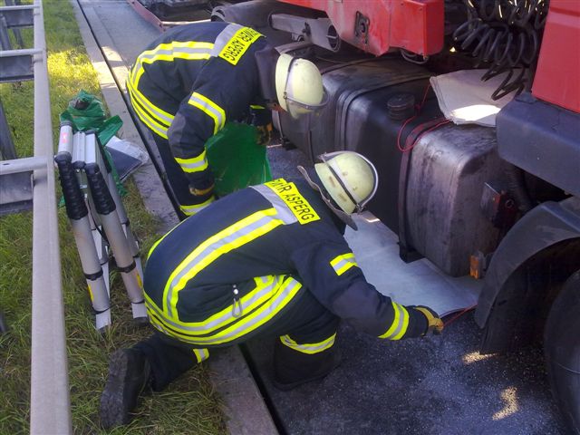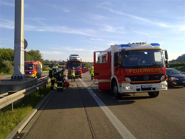 Am Dienstag wurde die Feuerwehr Asperg zusammen mit der Feuerwehr Ludwigsburg auf die Bundesautobahn A81 zu einem brennenden LKW alarmiert. Der Fahrer eines Sattelzuges bemerkte eine Rauchentwicklung an seinem Fahrzeug und verständigte über Notruf 112 die Feuerwehr. Nach Erkundung durch die ersten Einsatzkräfte vor Ort stellte sich heraus, dass es sich um kein offenes Feuer an dem Sattelzug handelte. Aufgrund eines technischen Defekts trat Hydrauliköl aus einer Leitung aus und verdampfte auf den heißen Anbauteilen des Führerhauses. Zudem glühten die Bremsen an der Hinterachse. Zum Kühlen der betroffenen Stellen kamen zwei Trupps mit zwei C-Rohren zum Einsatz. Ein weiterer Trupp stand in Bereitstellung. Parallel hierzu wurde das bereits ausgetretene Hydrauliköl mittels Bindemittel abgestreut und Spezialauffangmatten unter dem Sattelzug positioniert. In Absprache mit der Autobahnpolizei wurde die Einsatzstelle während des Einsatzes durch die Feuerwehr weiträumig abgesichert. Die rechte Fahrbahn wurde zeitweise voll gesperrt. Da der Sattelzug nicht mehr fahrbereit war musste er durch eine Spezialfirma abgeschleppt werden.