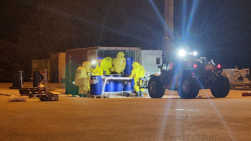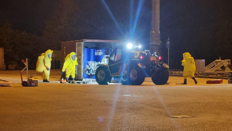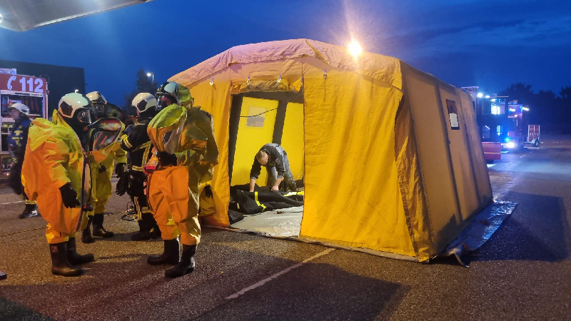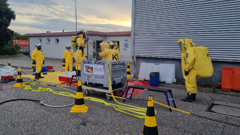 Fahrzeugaufgebot   Kommandowagen (KdoW)  Hilfeleistungslöschgruppenfahrzeug 1 (HLF 1)  Gerätewagen Gefahrgut (GW-G)  Anhänger mit Sonderlöschmittel  Gerätewagen Logistik (GW-L 1) (a.D.)