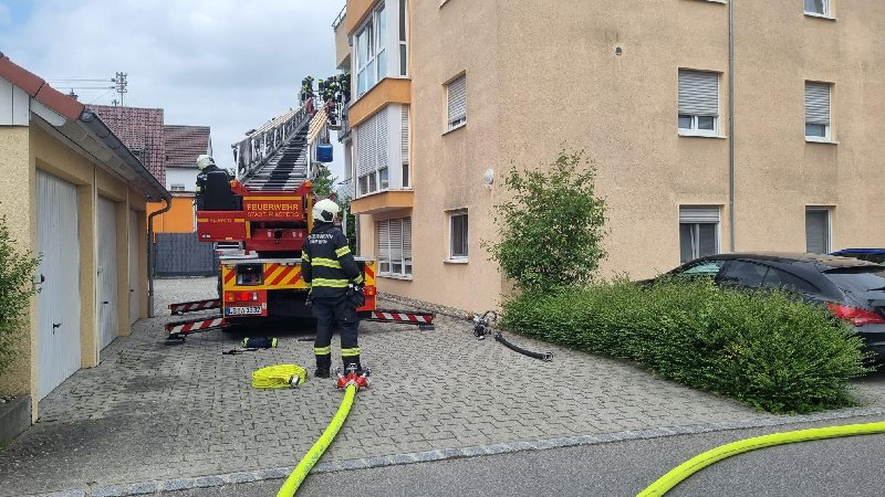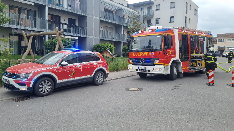 Fahrzeugaufgebot   Kommandowagen (KdoW)  Einsatzleitwagen (ELW 1)  Hilfeleistungslöschgruppenfahrzeug 1 (HLF 1)  Hilfeleistungslöschgruppenfahrzeug 2 (HLF 2)  Drehleiter (DLK 23/12)  Kleineinsatzfahrzeug (KEF)