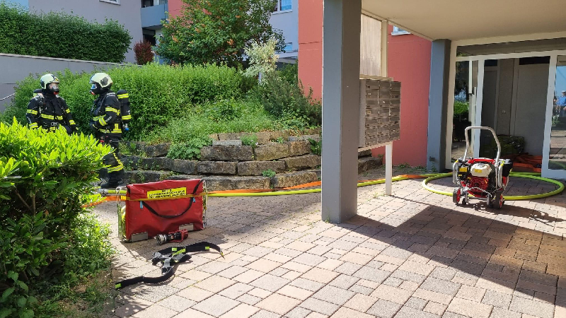 Fahrzeugaufgebot   Kommandowagen (KdoW)  Einsatzleitwagen (ELW 1)  Hilfeleistungslöschgruppenfahrzeug 1 (HLF 1)  Hilfeleistungslöschgruppenfahrzeug 2 (HLF 2)  Drehleiter (DLK 23/12)