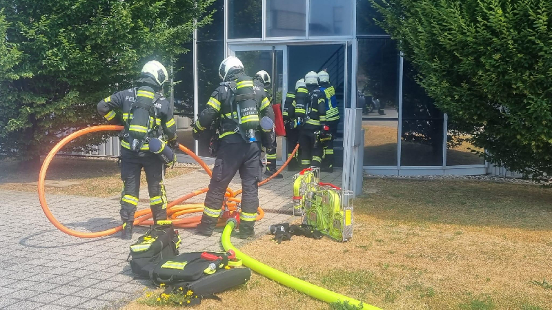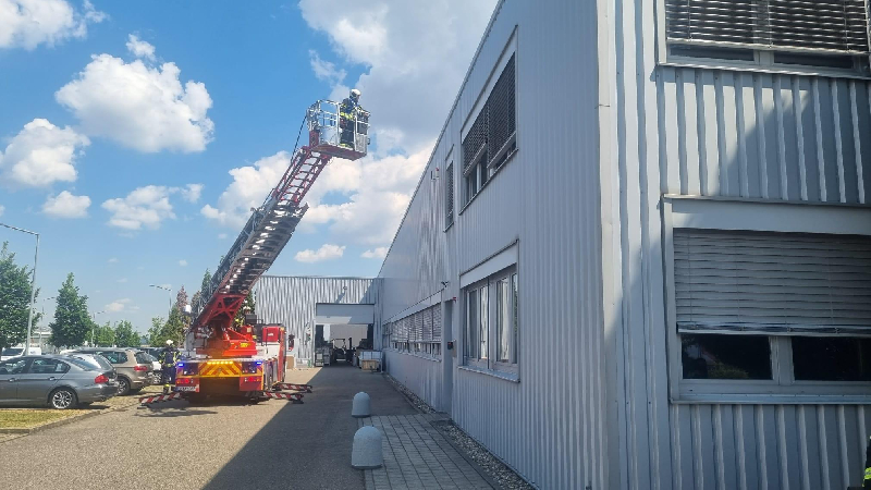Fahrzeugaufgebot   Kommandowagen (KdoW)  Einsatzleitwagen (ELW 1)  Hilfeleistungslöschgruppenfahrzeug 1 (HLF 1)  Hilfeleistungslöschgruppenfahrzeug 2 (HLF 2)  Drehleiter (DLK 23/12)  Anhänger mit Sonderlöschmittel  Gerätewagen Logistik (GW-L 1) (a.D.)